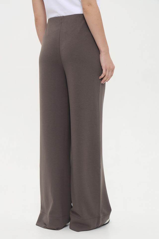 Брюки имеют прямой крой и широкие штанины, что обеспечивает свободу движений и создает элегантный силуэт. Эластичный пояс гарантирует комфортную посадку по фигуре.