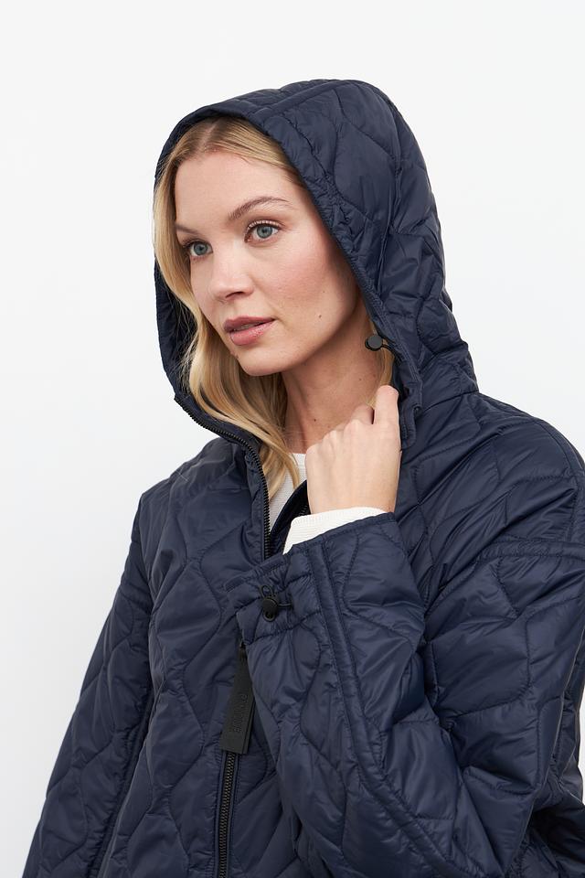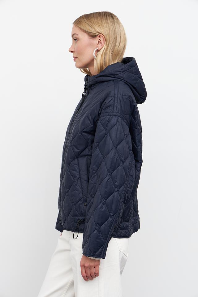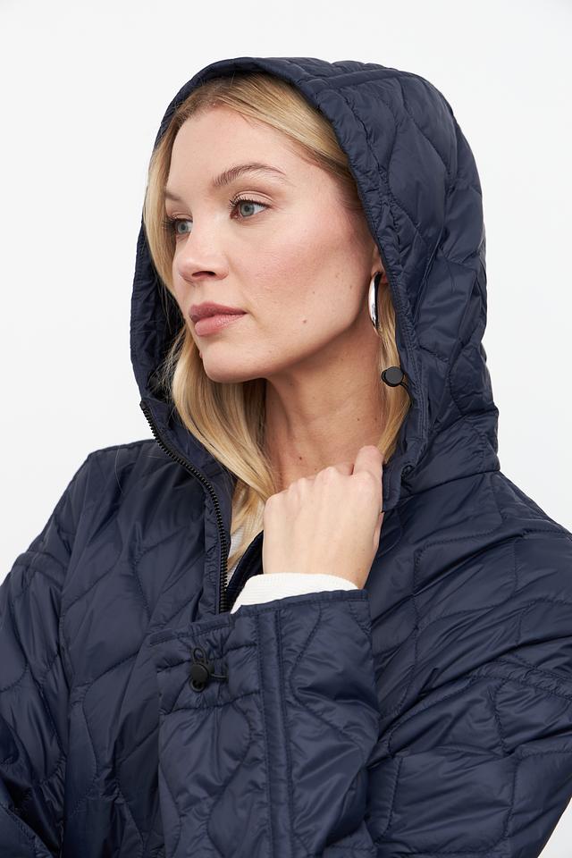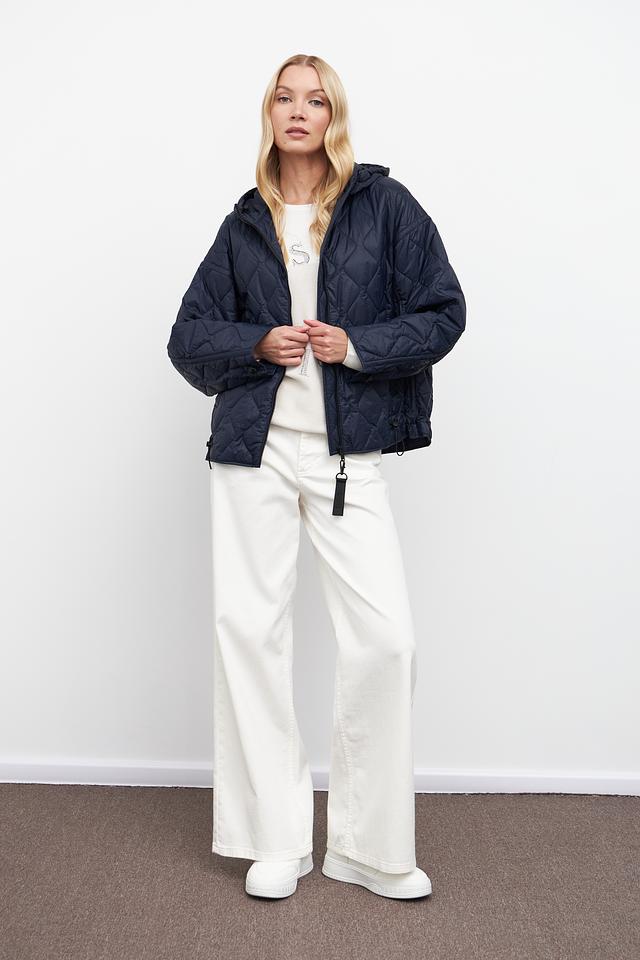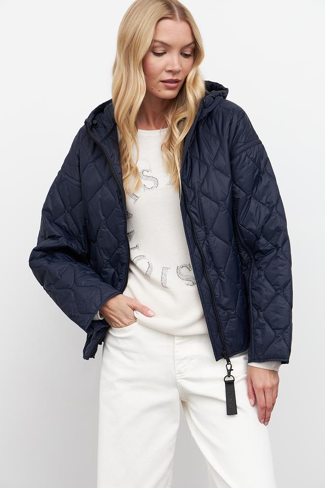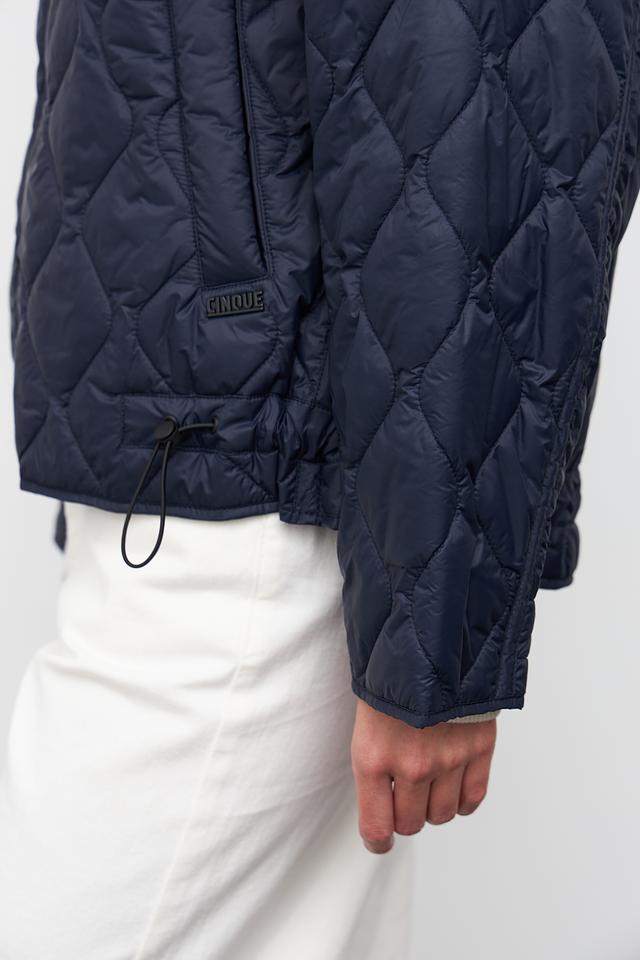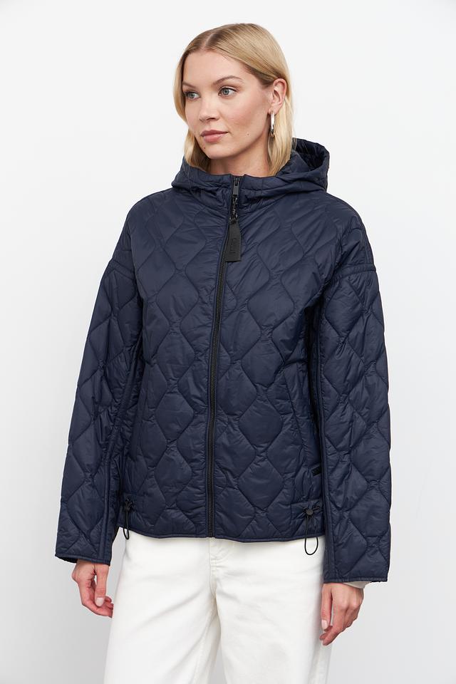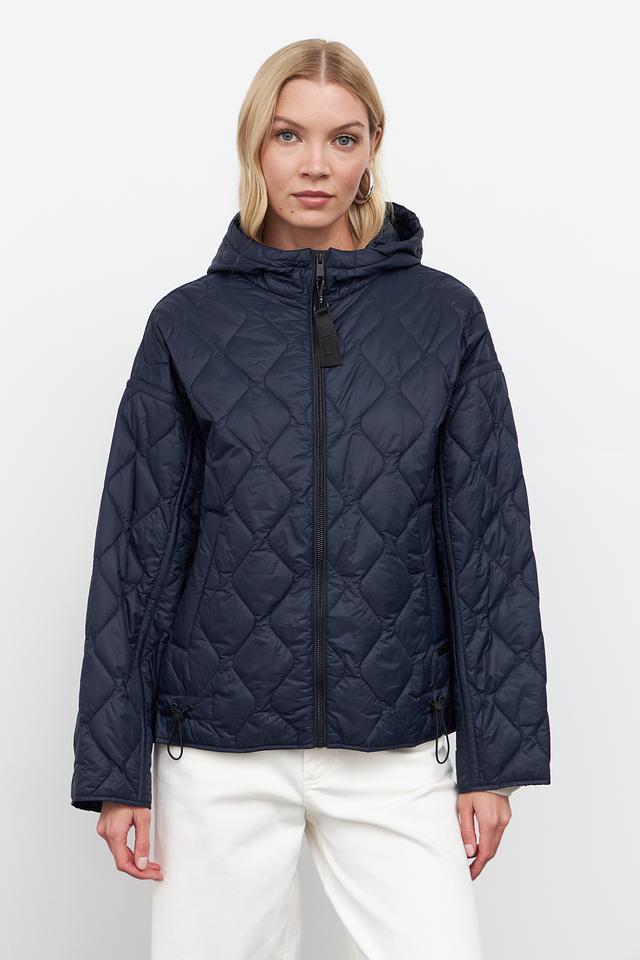 Стильная куртка Cinque синего цвета с объёмным стеганым дизайном. Модель с капюшоном и застежкой-молнией, дополнена шнурками на рукавах и по низу изделия для регулировки силуэта. Состав: полиамид 100%