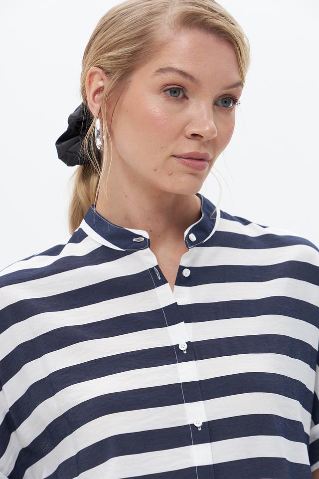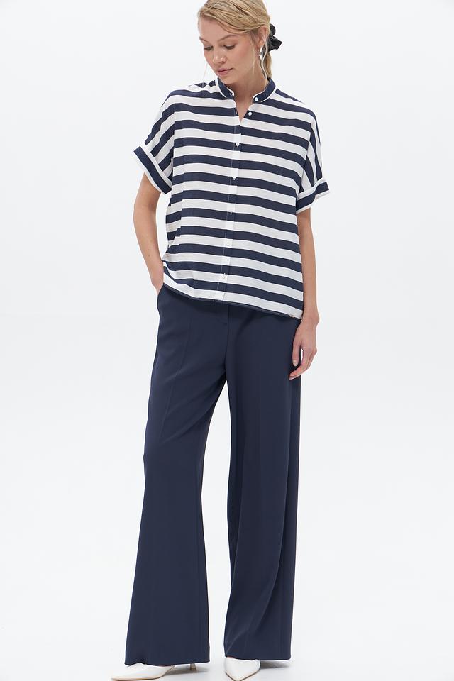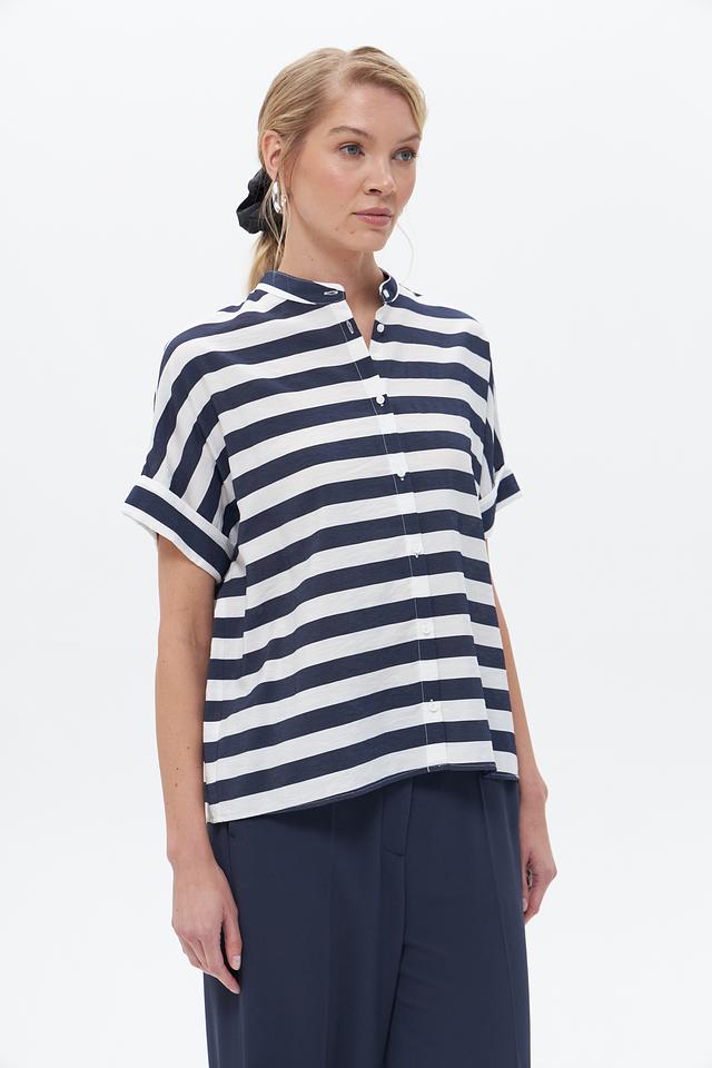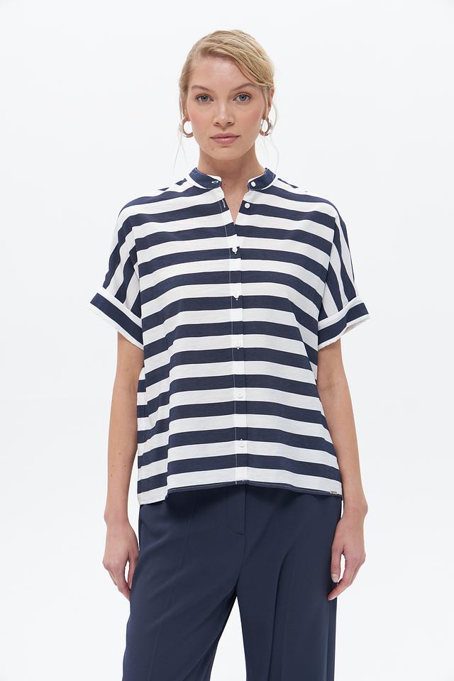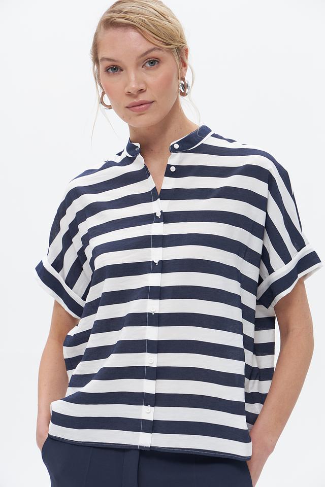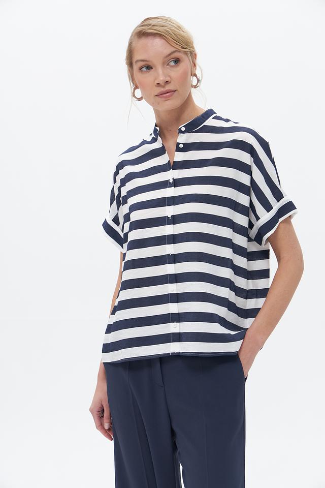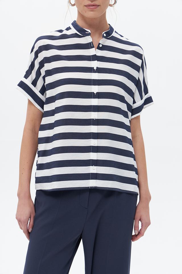 Блуза Cinque синего и белого цвета с короткими рукавами и воротником-стойкой. Изготовлена из вискозы с добавлением полиамида, что обеспечивает комфорт и приятные тактильные ощущения. Стильный и универсальный вариант для создания повседневных образов. Состав: вискоза 83%, полиамид 17%