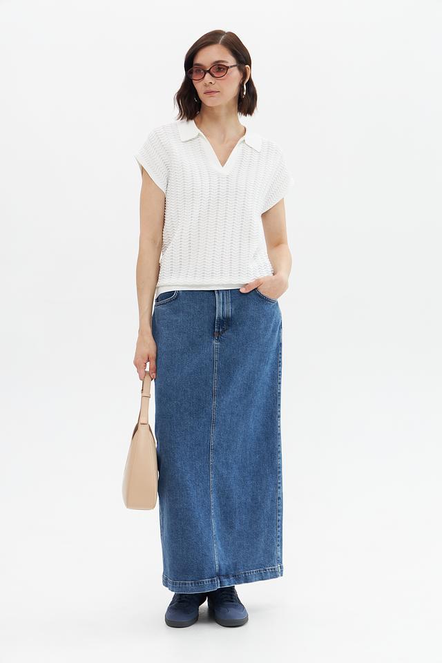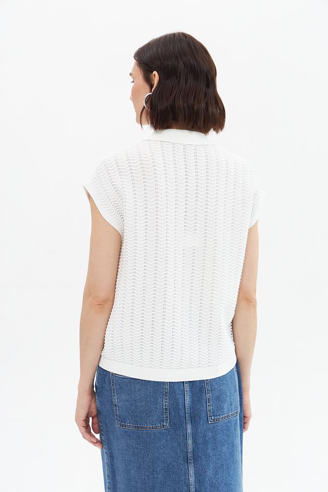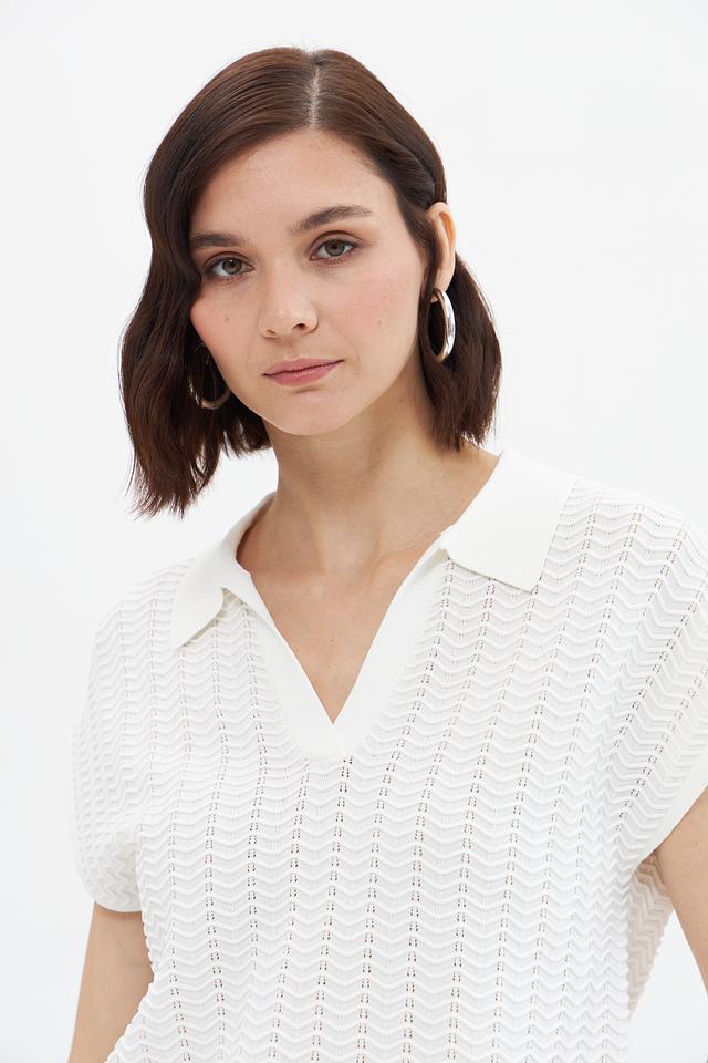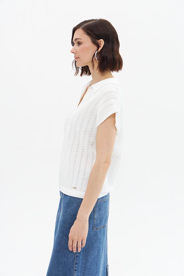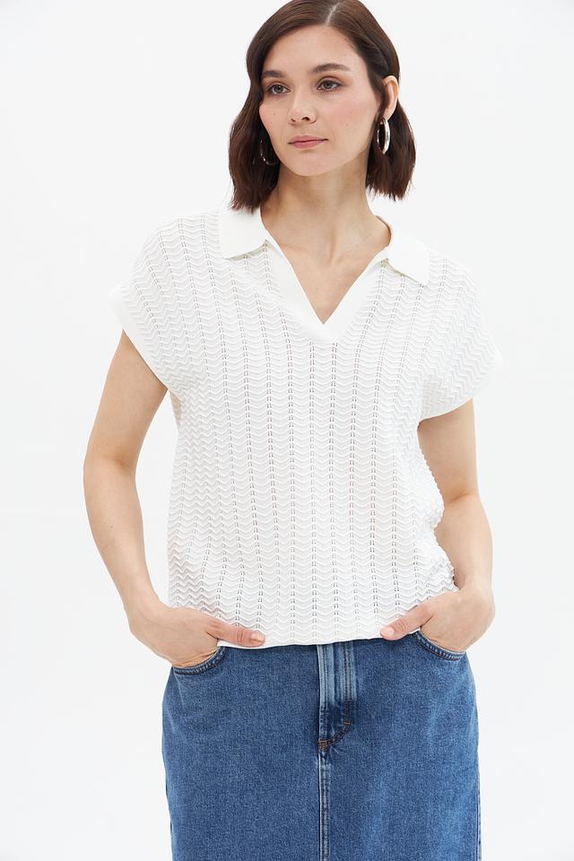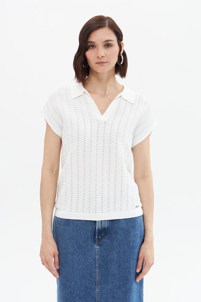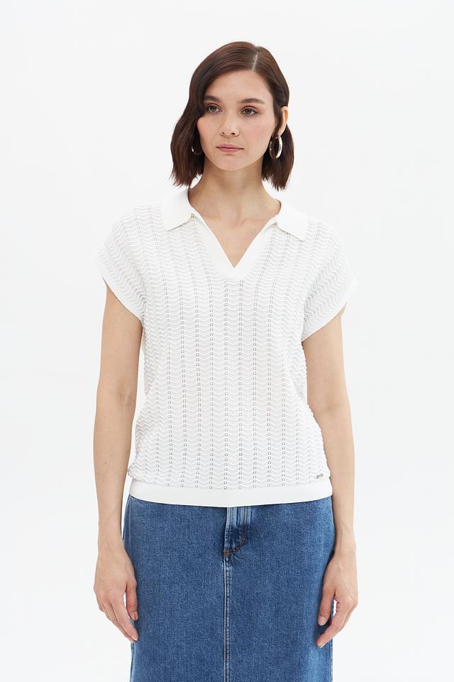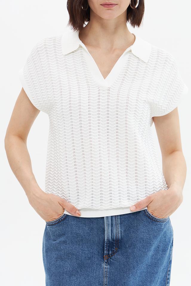 Пуловер имеет короткие рукава и классический воротник-поло, что придает ему элегантный и современный вид. Текстура вязки с выраженным узором добавляет изделию оригинальности и изысканности.