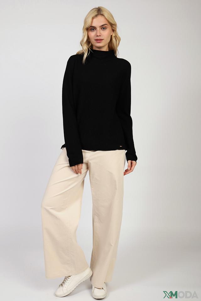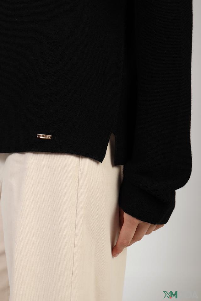 Пуловер имеет прямой крой и высокий горл, что придает ему элегантный и современный вид. Небольшой декоративный элемент с логотипом бренда на груди добавляет изысканности. Модель идеально подходит для создания как повседневных, так и более формальных образов.