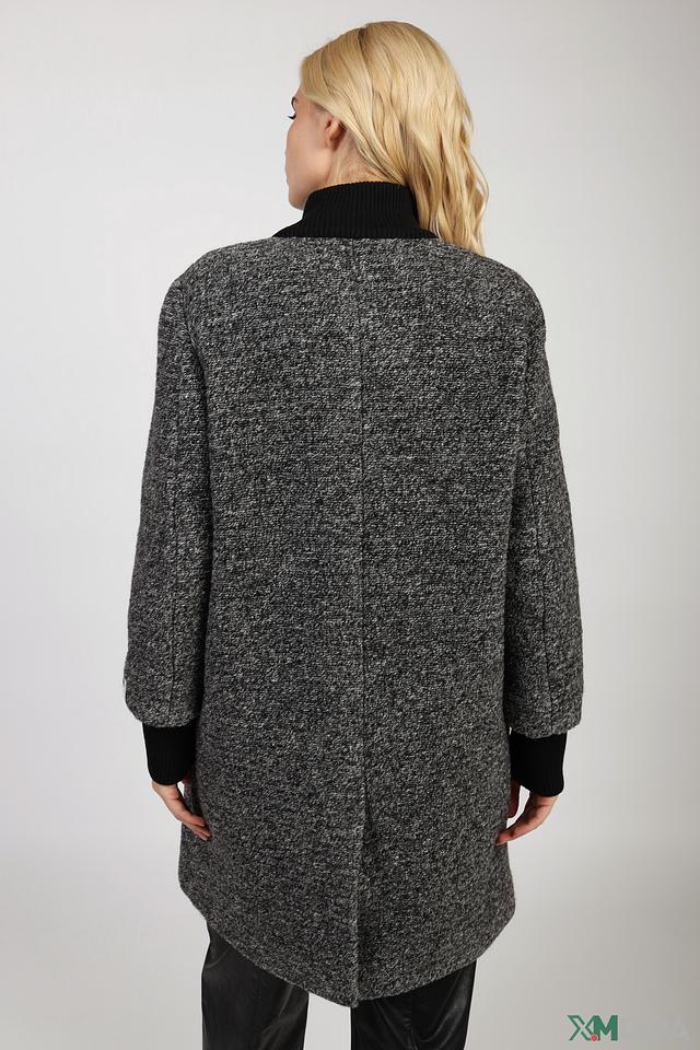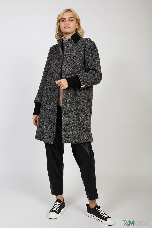 Пальто от бренда Cinque выполнено из смеси шерсти, хлопка и полиэстера. Преобладающий цвет – серый меланж, создающий эффект текстуры. Модель имеет прямой крой, который обеспечивает комфортную посадку по фигуре.