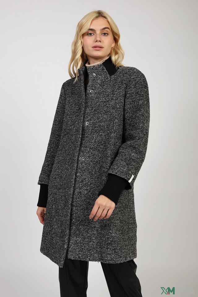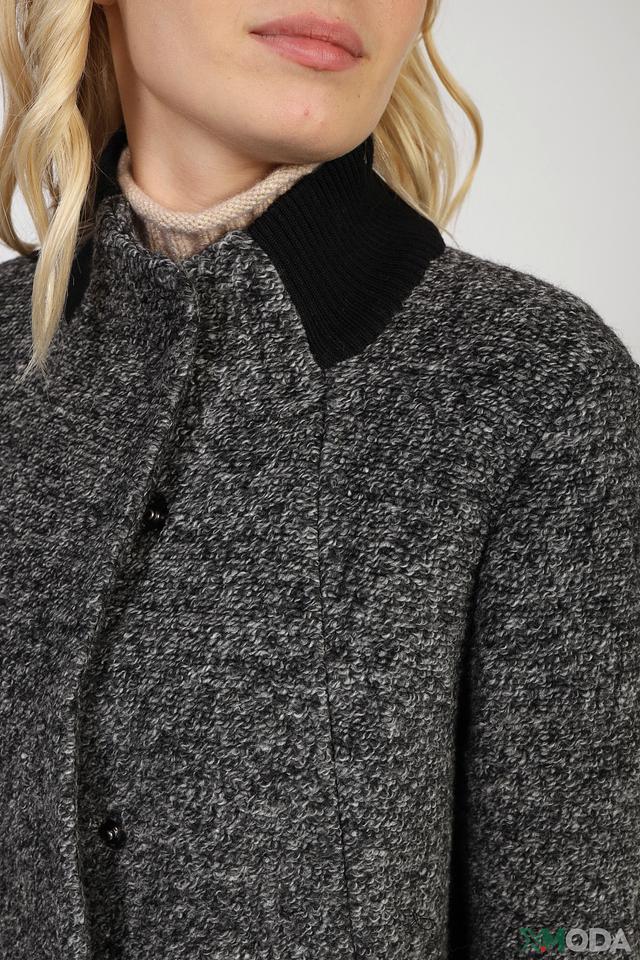 Пальто застегивается на пуговицы, имеет воротник-стойку и манжеты из черной трикотажной ткани. Боковые карманы добавляют функциональности. Подкладка выполнена из 100% полиэстера.