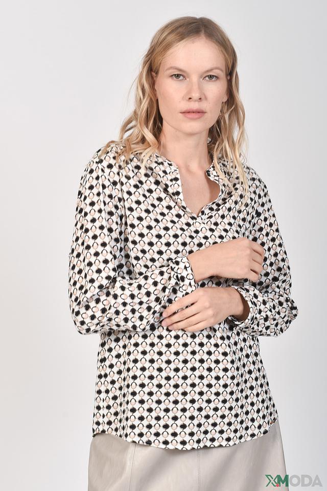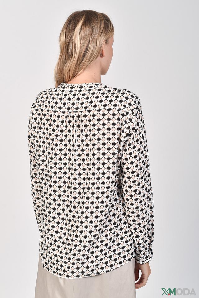 Особенностью данной модели является оригинальный геометрический принт, сочетающий в себе черные, белые и бежевые оттенки. V-образный вырез горловины добавляет образу женственности и изящества. Блуза идеально подойдет для создания как повседневных, так и более нарядных образов.