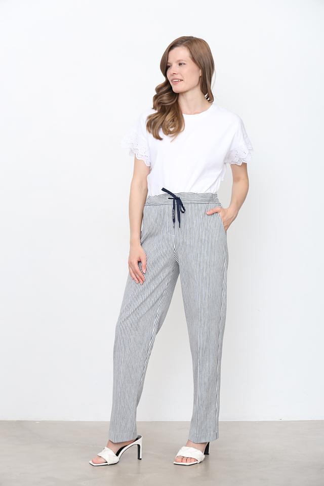 Женские брюки Circolo 1901 синего и белого цвета в классическую полоску. Модель выполнена из хлопка с добавлением эластана для комфорта и свободы движений, имеет удобный пояс на резинке и завязки. Состав: хлопок 97%, эластан 3%
