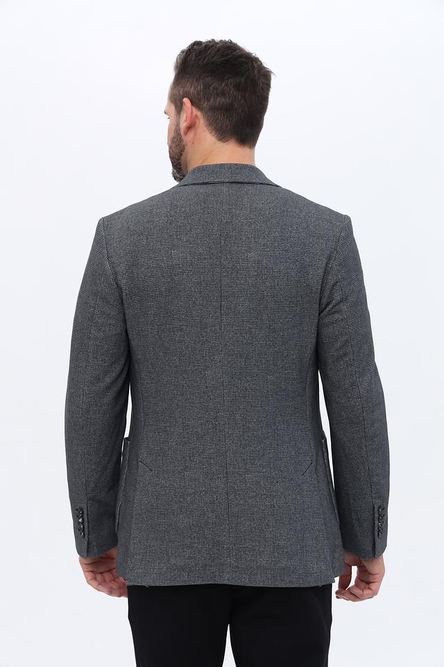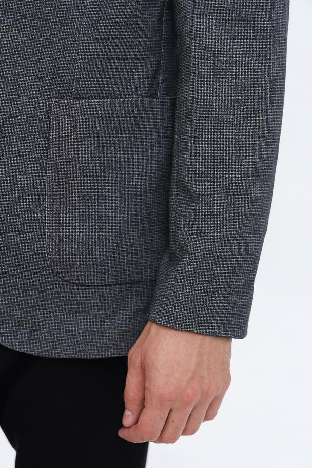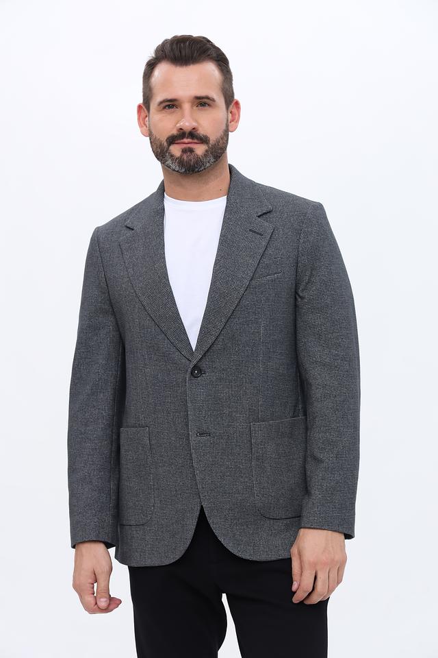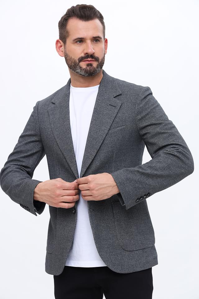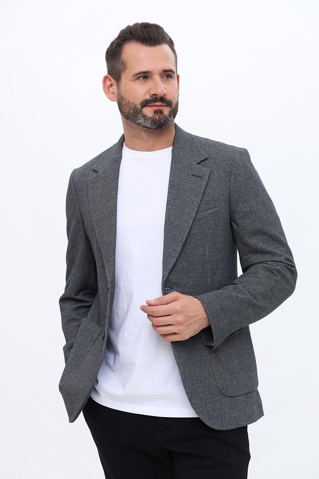 Пиджак имеет классический крой и выполнен в серую клетку, что делает его универсальным для создания различных образов. Он идеально подойдет как для деловых встреч, так и для повседневной носки.