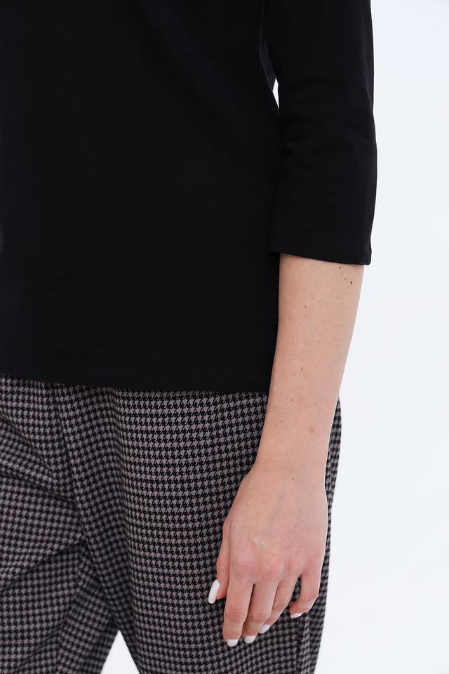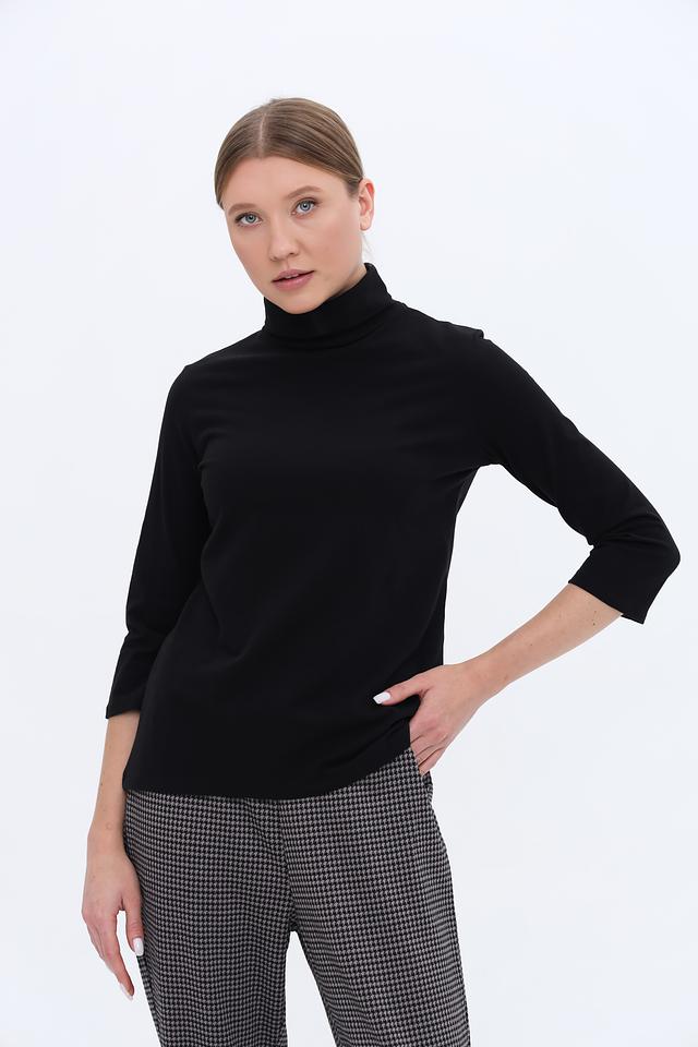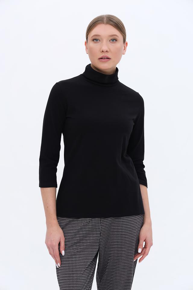 Модель имеет высокий горл, который визуально удлиняет шею и придает образу изысканность. Рукав 3/4 делает этот джемпер подходящим для любого времени года. Прямой крой обеспечивает свободу движений и комфортную посадку по фигуре.