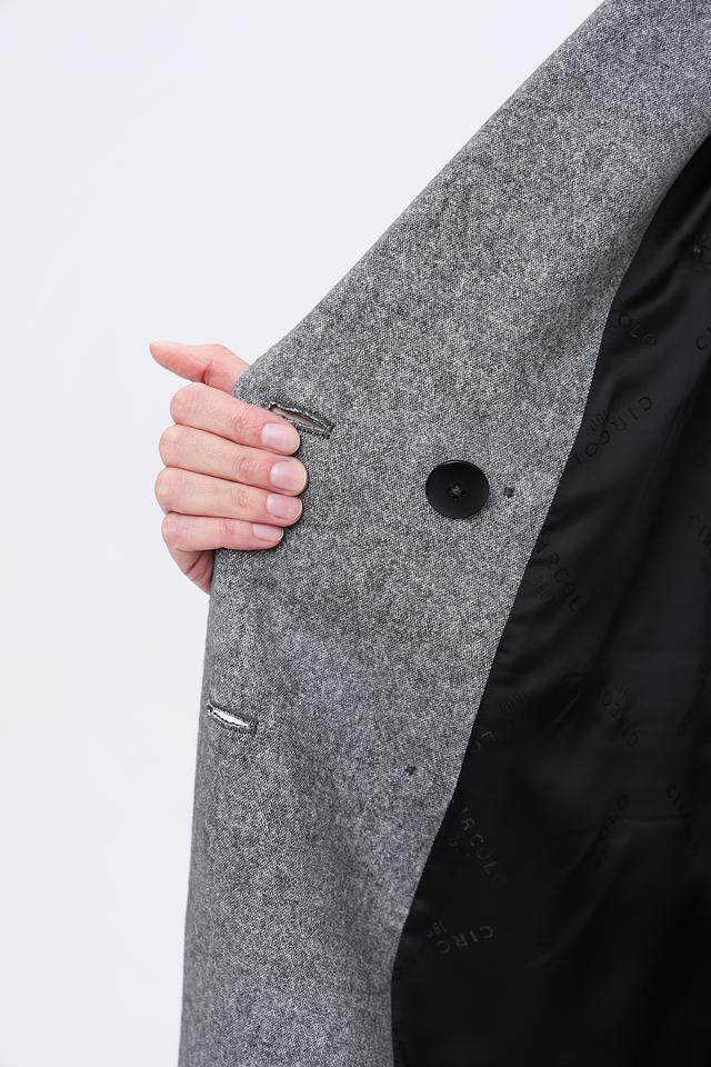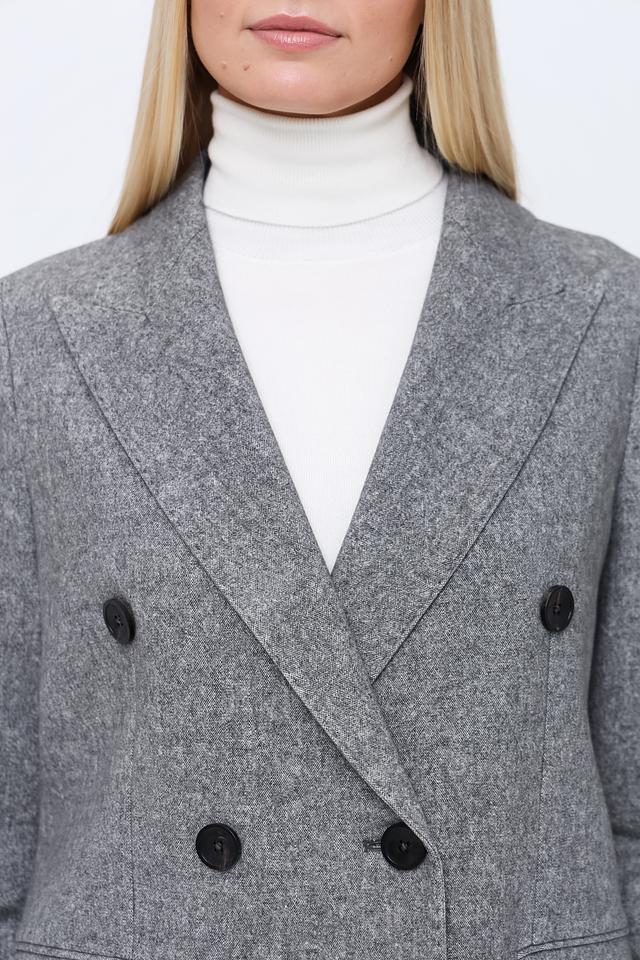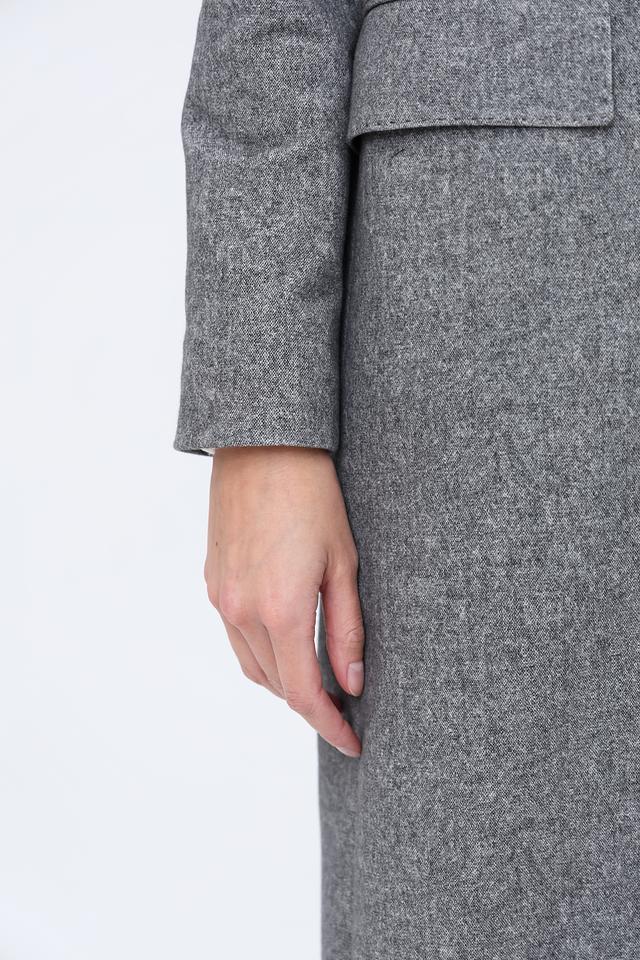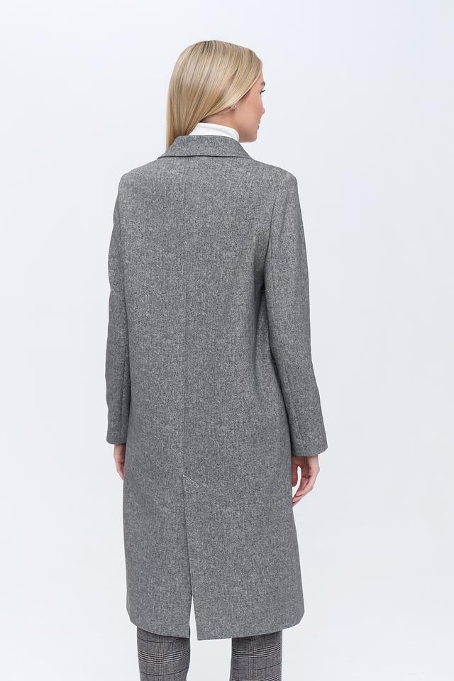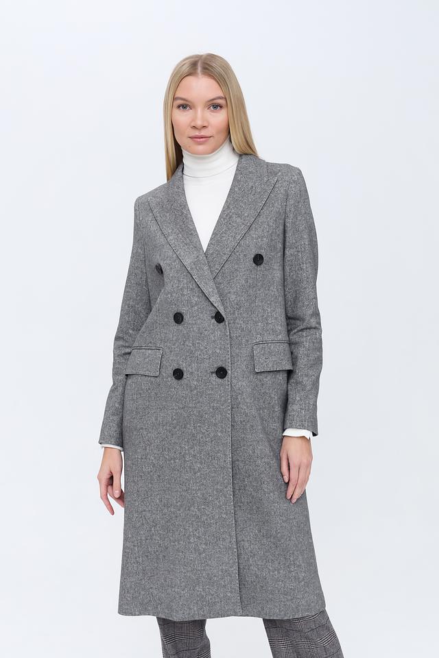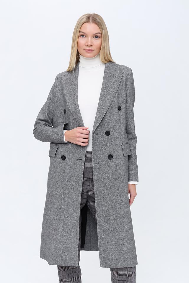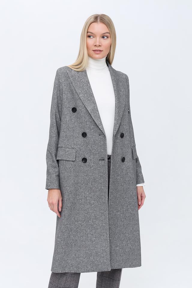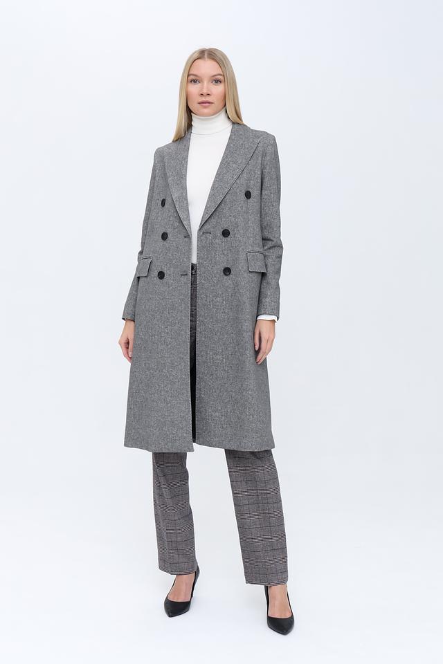 Пальто имеет двубортную застёжку на пуговицы, которые гармонично сочетаются с общим дизайном. Отложной воротник добавляет пальто классический вид. Боковые карманы обеспечивают функциональность и удобство.