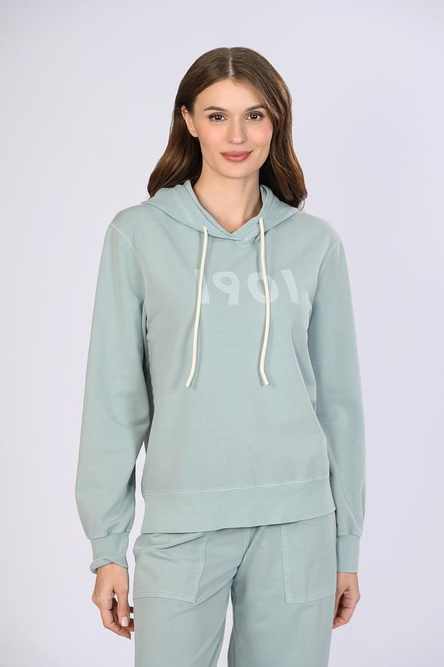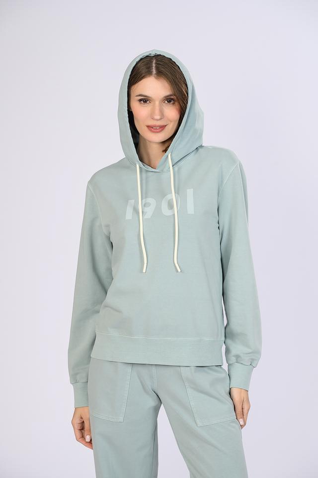 Модель имеет удобный капюшон со шнурками бежевого цвета, которые добавляют контраст и оригинальность. На передней части джемпера расположена надпись "1901", выполненная в светло-сером цвете.