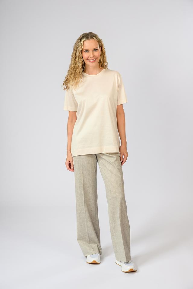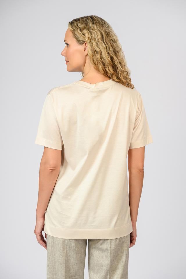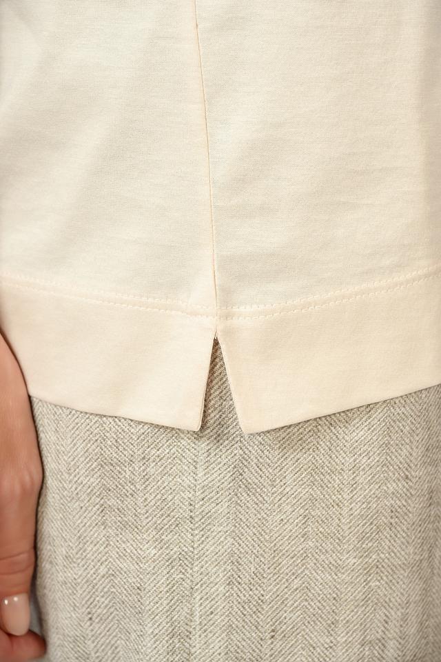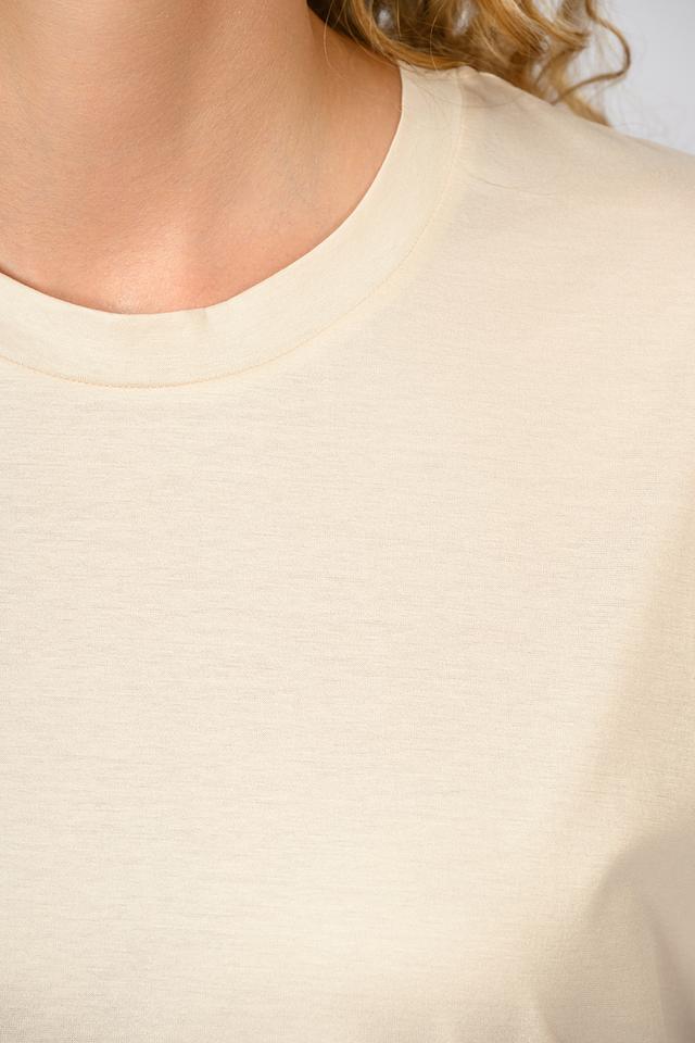 Цвет футболки – бежевый, нейтральный и легко сочетаемый с другими элементами гардероба. Короткие рукава делают ее идеальным выбором для теплой погоды. Минималистичный дизайн позволяет сочетать футболку с различными стилями одежды – от повседневных до более элегантных.