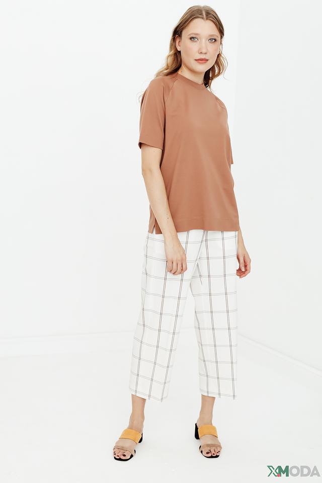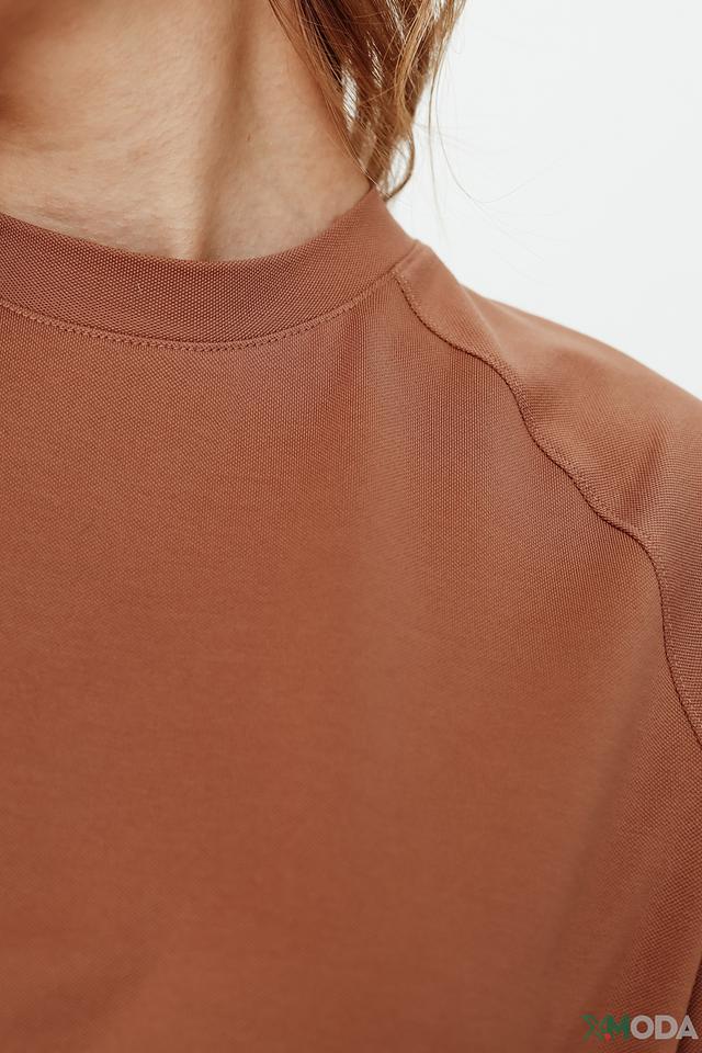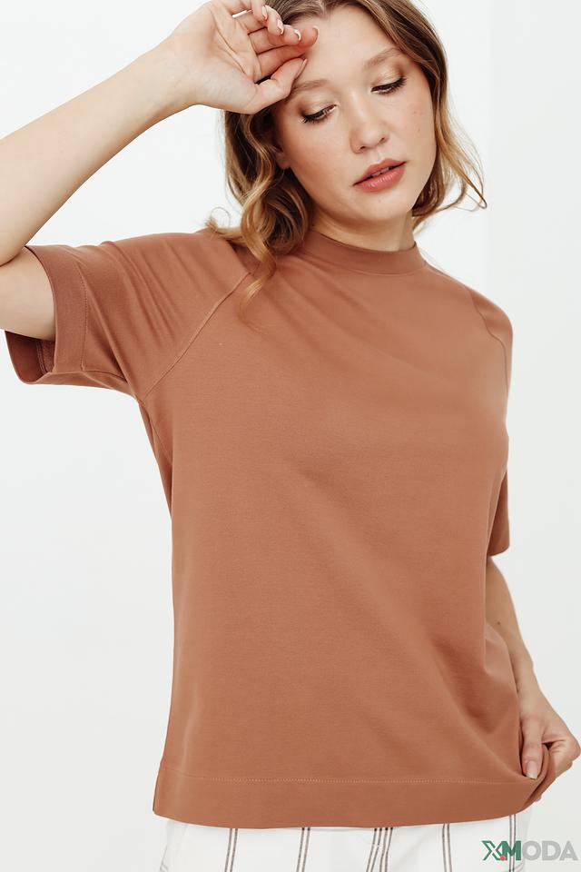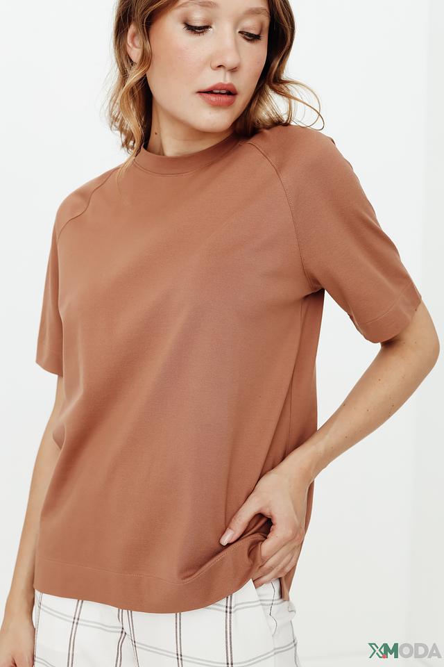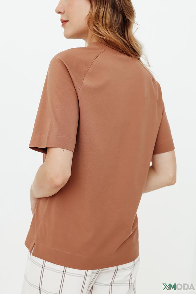Джемпер имеет прямой крой, короткий рукав и округлый вырез горловины. Цвет изделия – терракотовый, который отлично сочетается с различными оттенками и стилями одежды.