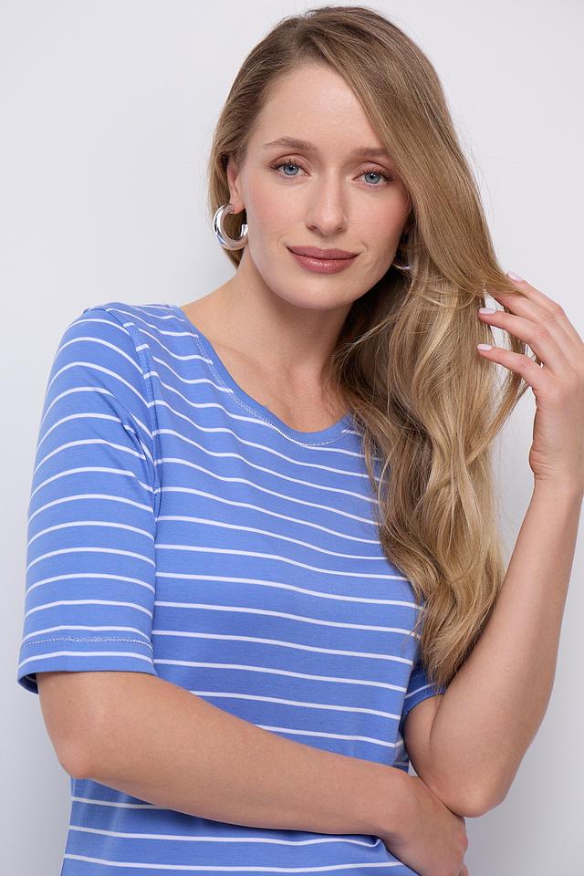 Футболка имеет классический крой и короткий рукав. Голубой цвет с белой полоской придает ей свежий и легкий вид. Округлый вырез горловины обеспечивает удобство и свободу движений.