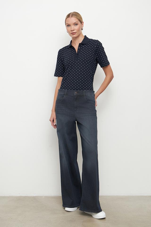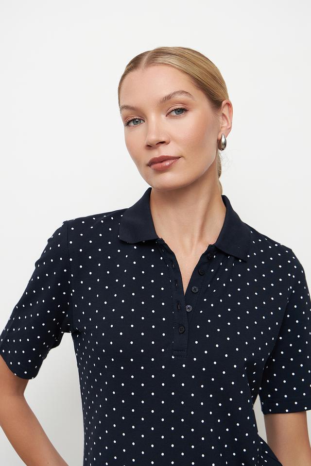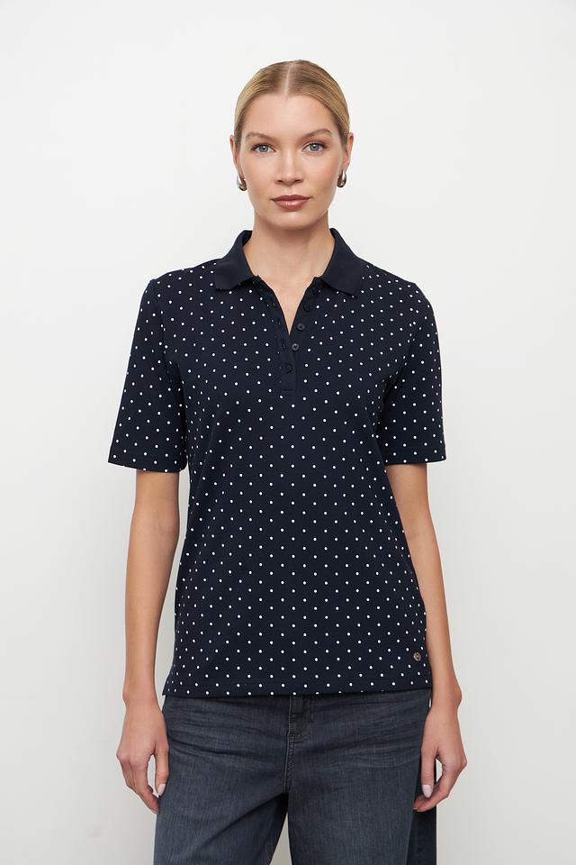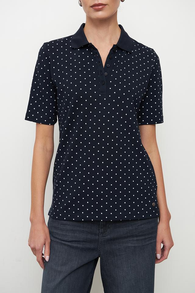 Это женское поло от бренда Clarina выполнено в темно-синем цвете и украшено мелким белым горошком. Модель имеет классический крой с короткими рукавами и воротником-поло.