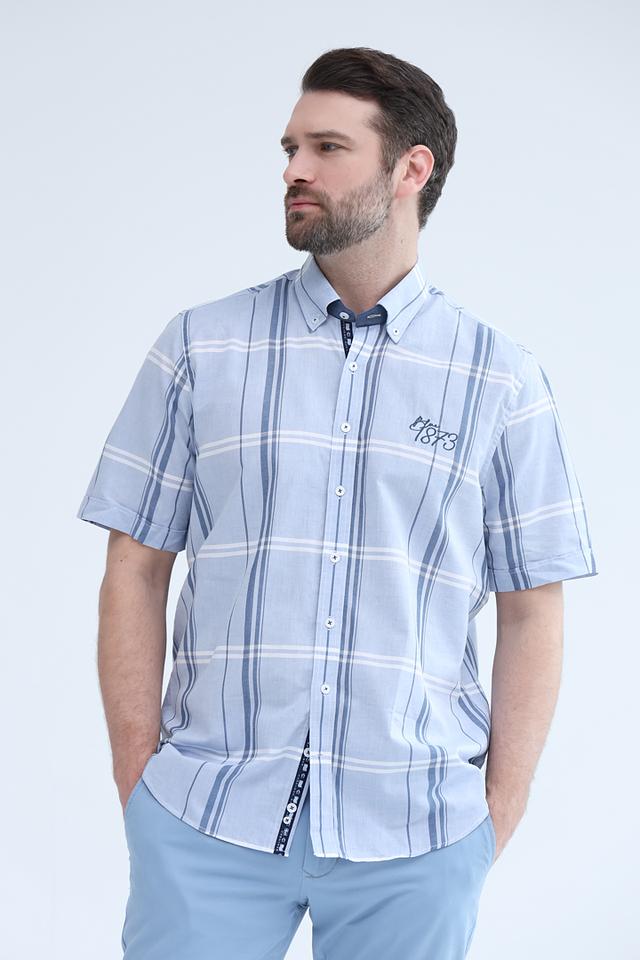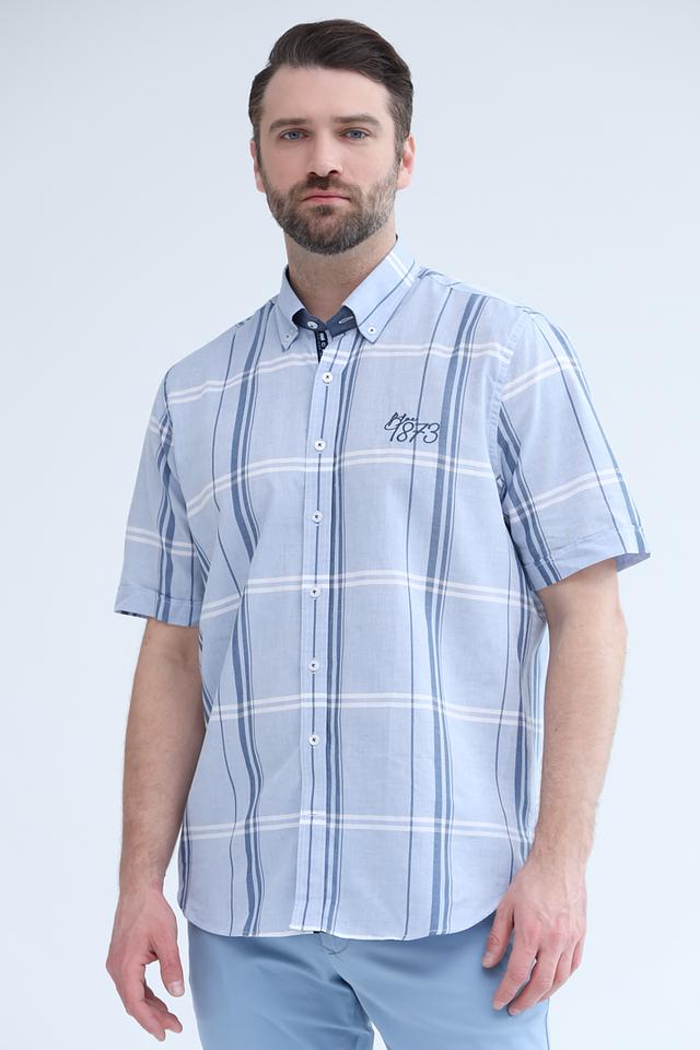 Рубашка имеет короткий рукав, классический воротник и застежку на пуговицы. На груди расположена небольшая вышивка с надписью "1873", добавляющая индивидуальности.