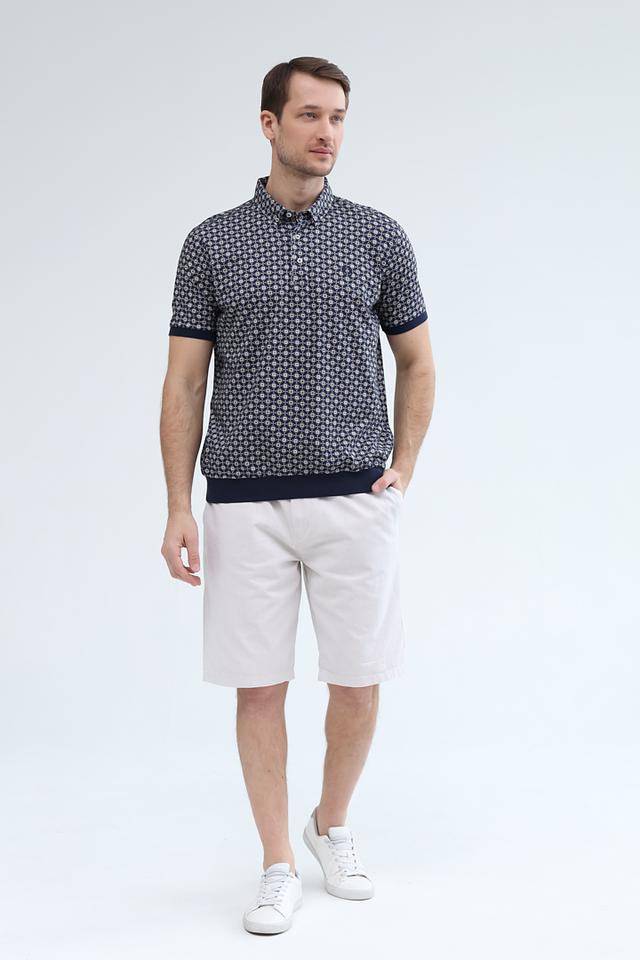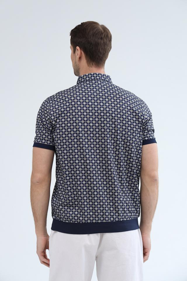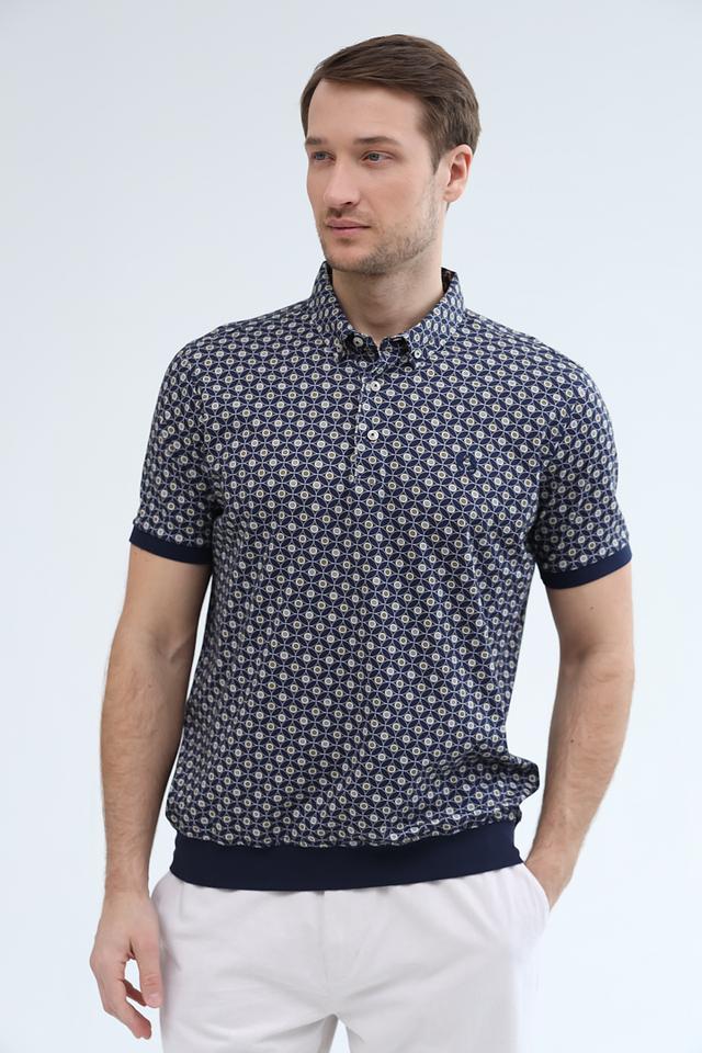 Темно-синий цвет поло гармонично сочетается с белым узором, создавая свежий и современный образ. Поло имеет короткие рукава и стандартную посадку, обеспечивающую свободу движений. Эта модель станет отличным выбором для тех, кто ценит комфорт и стиль.