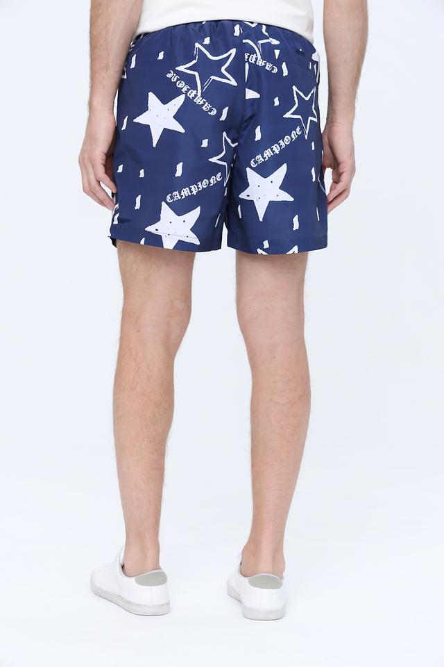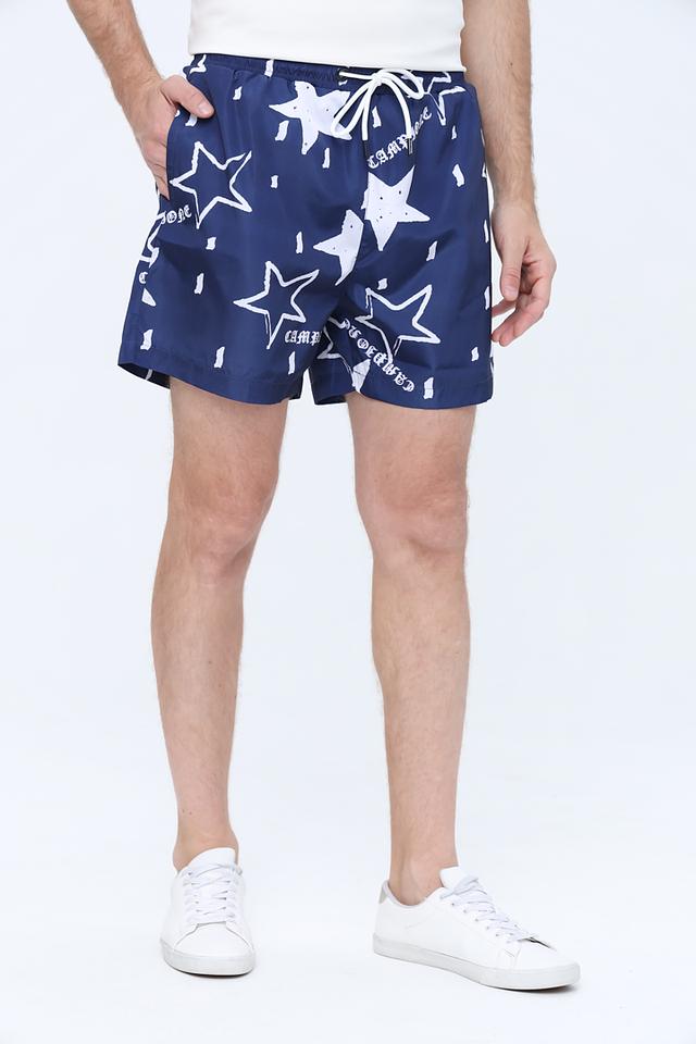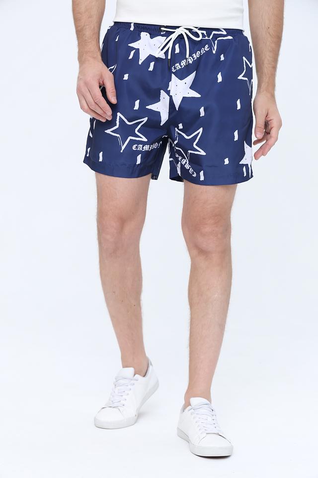 Представляем стильные мужские шорты от бренда Claudio Campione. Данная модель выполнена в насыщенном синем цвете и украшена оригинальным принтом из белых звёзд и надписей с названием бренда.