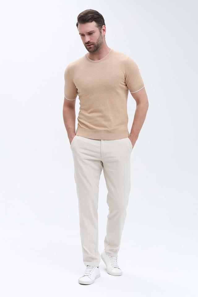 Брюки изготовлены из смесовой ткани, в состав которой входит 56% лен, 41% полиэстер и 3% эластан. Лен обеспечивает воздухопроницаемость и комфорт в жаркую погоду, полиэстер добавляет прочности и устойчивости к сминанию, а эластан обеспечивает свободу движений.