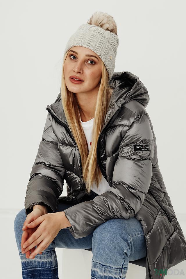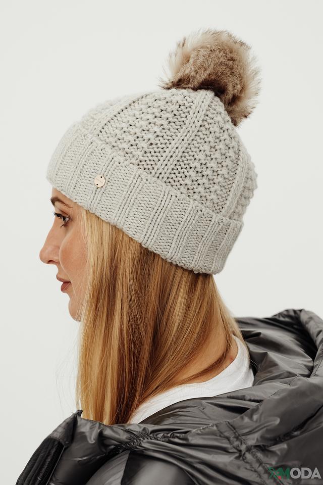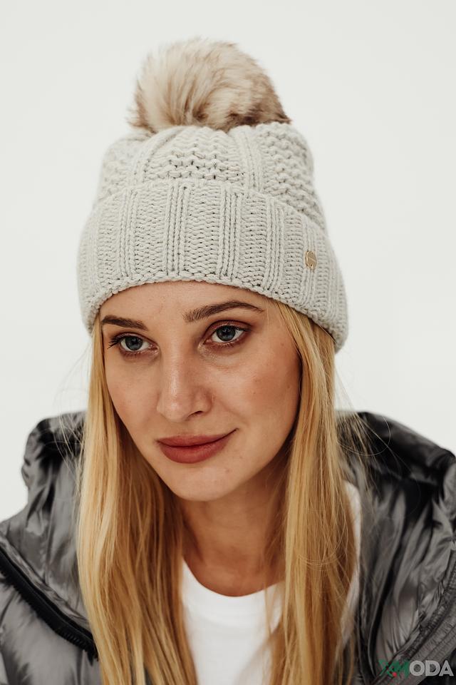 Шапка имеет классическую форму и украшена объёмным меховым помпоном, который придаёт ей игривый и стильный вид. Небольшой металлизированный логотип бренда добавляет шапке изысканности.
