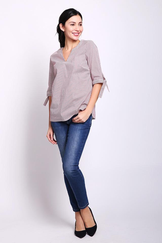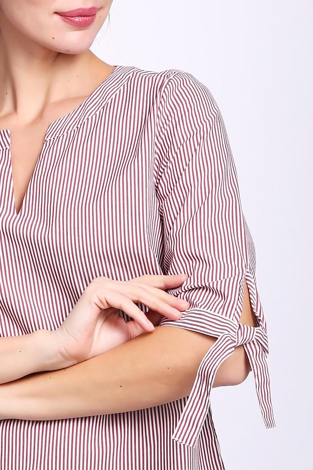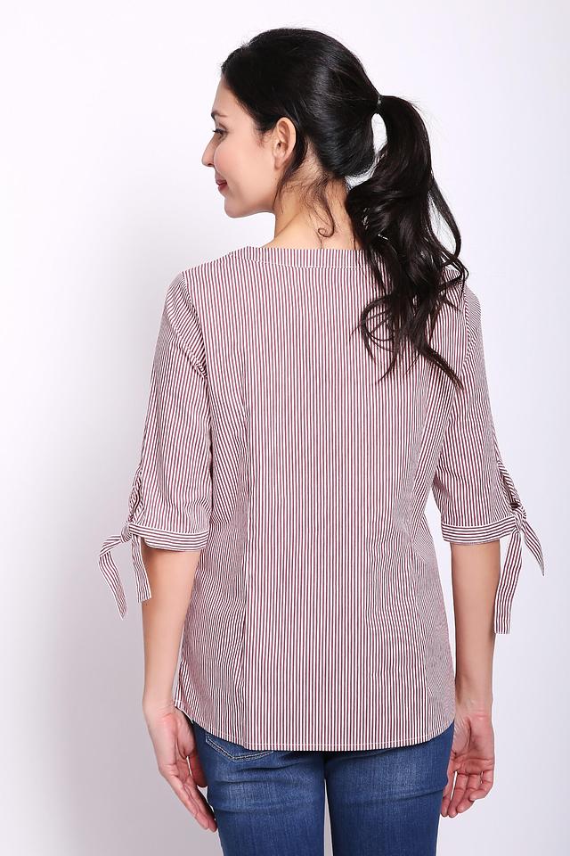 Блуза имеет V-образный вырез горловины и короткие рукава, которые заканчиваются завязками-бантиками. Благодаря этому рукава можно регулировать по длине и создавать разные образы.