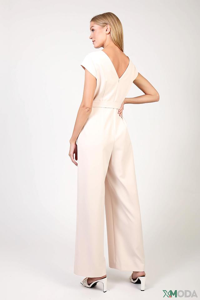 Комбинезон имеет прямой крой, V-образный вырез и короткие рукава. Акцентным элементом является приталенный пояс, который визуально подчеркивает талию и создает женственный силуэт. Застежка на спине выполнена в виде потайной молнии.