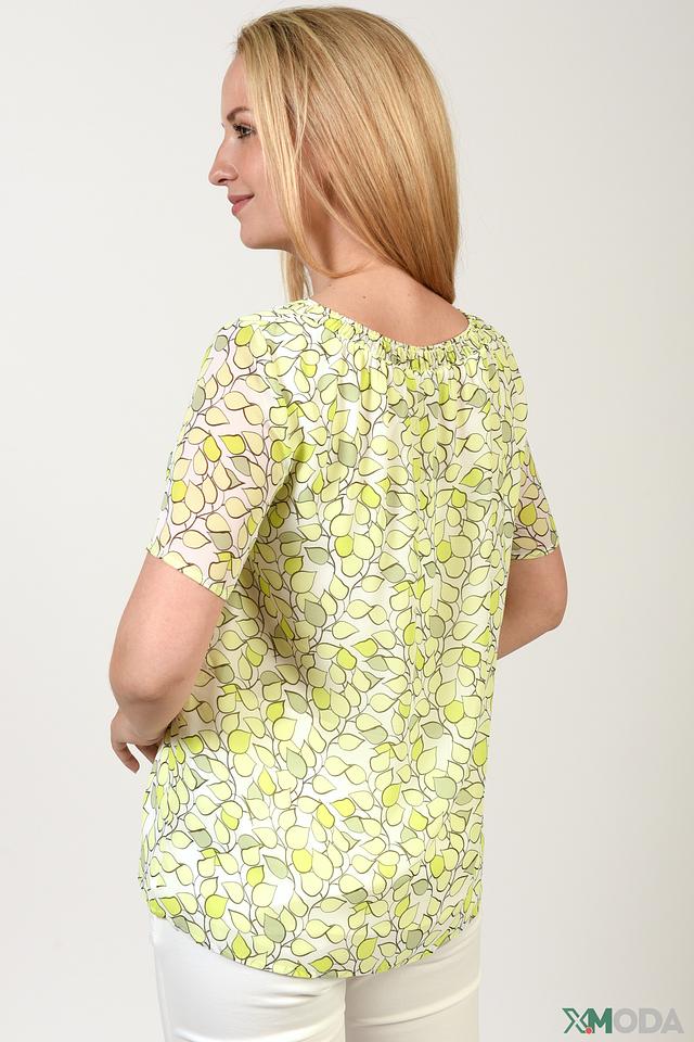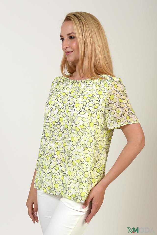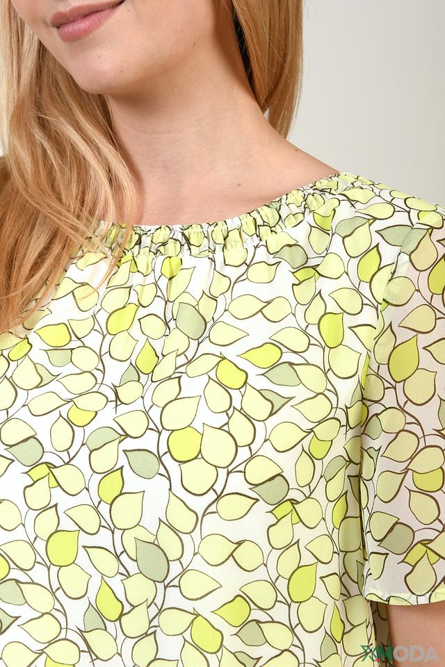 Особенностью данной модели является её яркий цветочный принт, состоящий из нежных оттенков зелёного и белого. Округлый вырез горловины и короткие рукава делают эту блузу идеальной для тёплой погоды. Свободный крой обеспечивает комфорт и свободу движений.