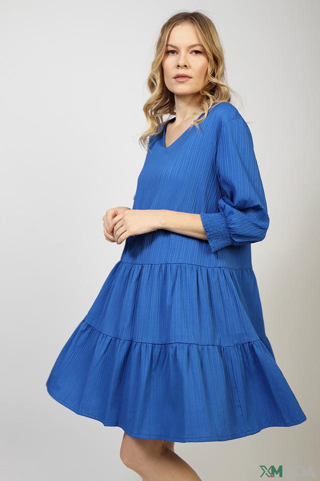 Платье имеет V-образный вырез и короткие рукава с манжетами, собранными резинкой. Силуэт платья – свободный, А-образный, с акцентом на талии благодаря сборкам. Нижняя часть платья оформлена в виде многослойной оборки, что добавляет образу воздушности и динамики.