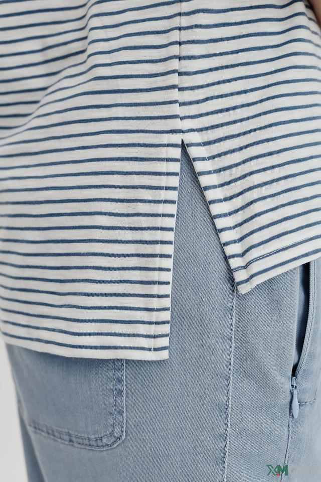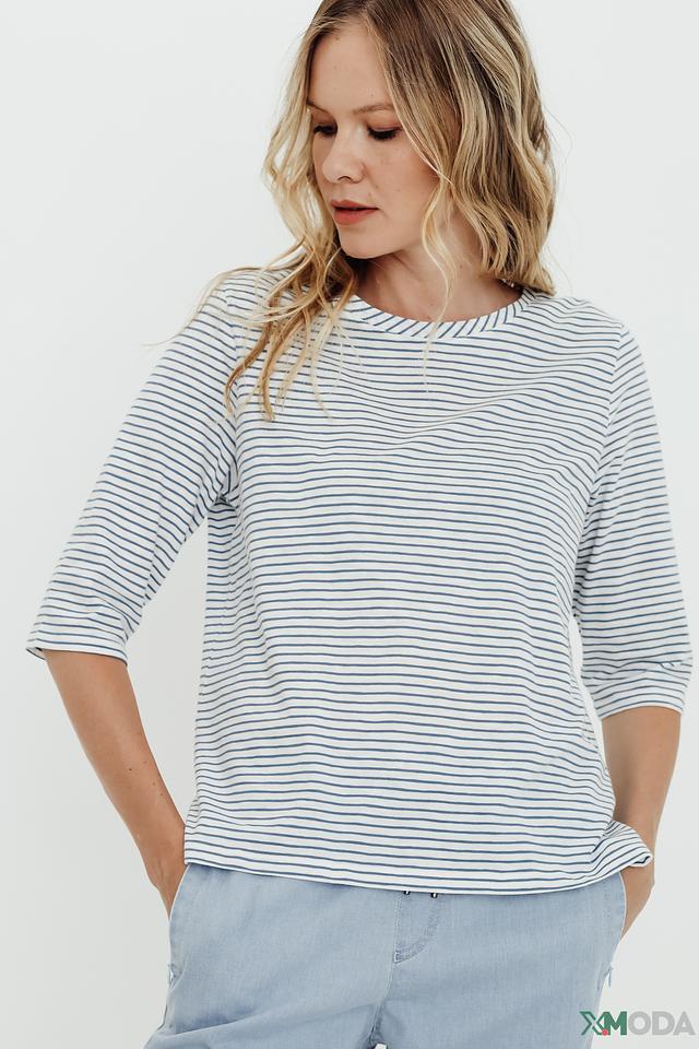 Женский джемпер Comma белого и голубого цвета в классическую полоску. Изготовлен из 100% хлопка, обеспечивающего комфорт и воздухопроницаемость. Укороченный рукав делает этот джемпер идеальным выбором для теплой погоды. Состав: хлопок 100%