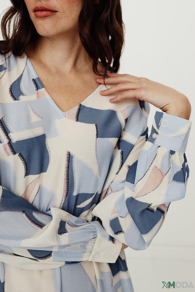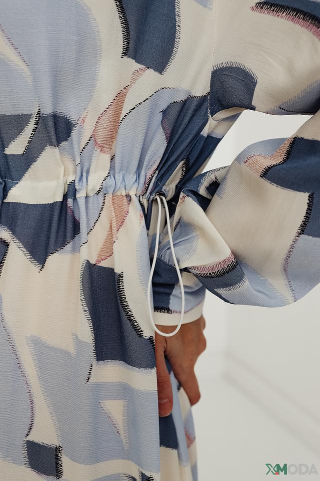 Особенностью этого платья является оригинальный абстрактный принт в светло-голубой, бежевой и серой цветовой гамме. Пояс подчеркивает талию и создает женственный силуэт. Разрез спереди добавляет образу легкости и непринужденности.