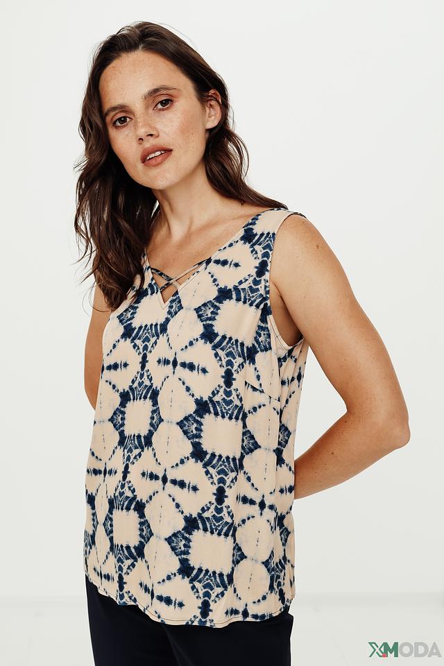 Топ Comma бежевого цвета с оригинальным принтом в стиле тай-дай станет отличным дополнением к летнему гардеробу. Модель без рукавов с V-образным вырезом и тонкими бретелями. Состав: вискоза 100%