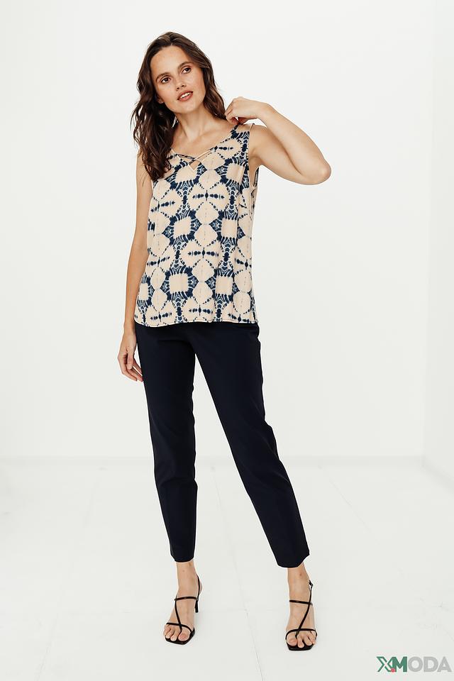 Топ имеет свободный крой, не сковывающий движений, и V-образный вырез, который визуально удлиняет шею. Тонкие бретели добавляют легкости и женственности образу. Декоративные переплетения бретелей на груди создают интересный акцент.