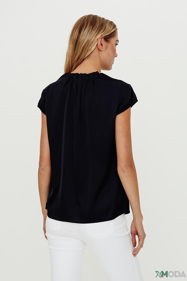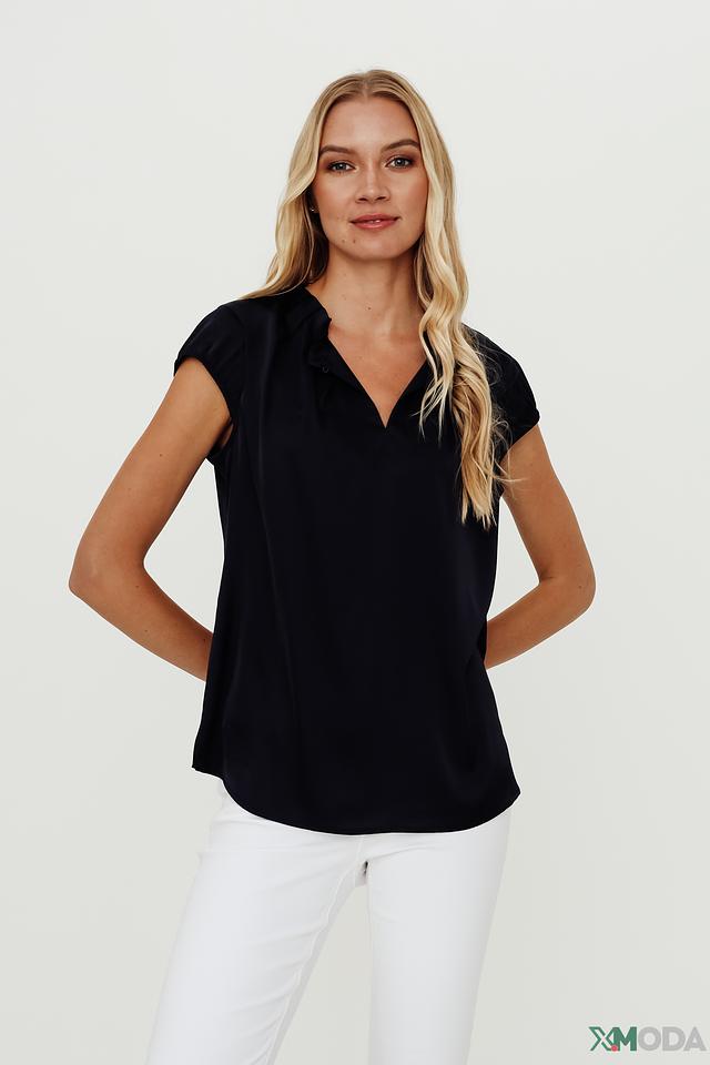 Блуза имеет V-образный вырез, который визуально удлиняет шею и делает образ более изящным. Короткие рукава и свободный крой обеспечивают комфорт в жаркую погоду. Слегка присобранная ткань на плечах добавляет блузе лёгкости и воздушности.