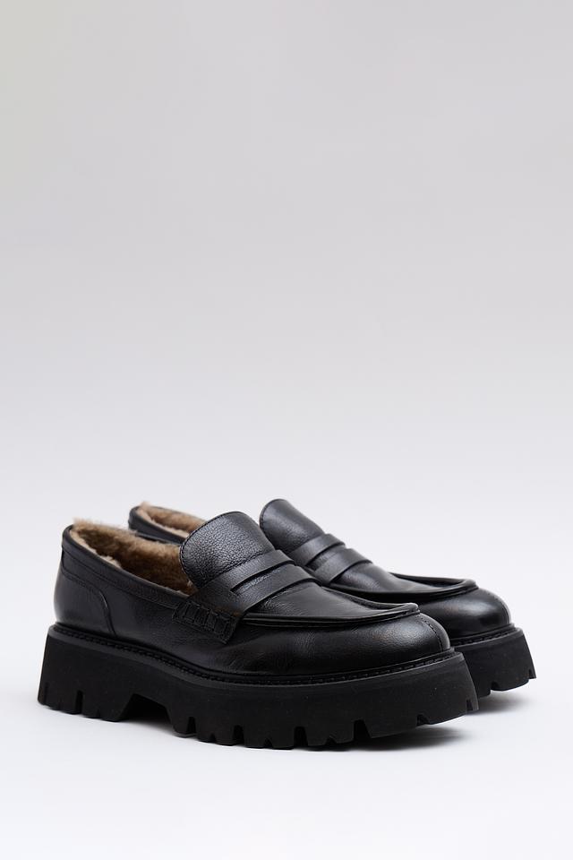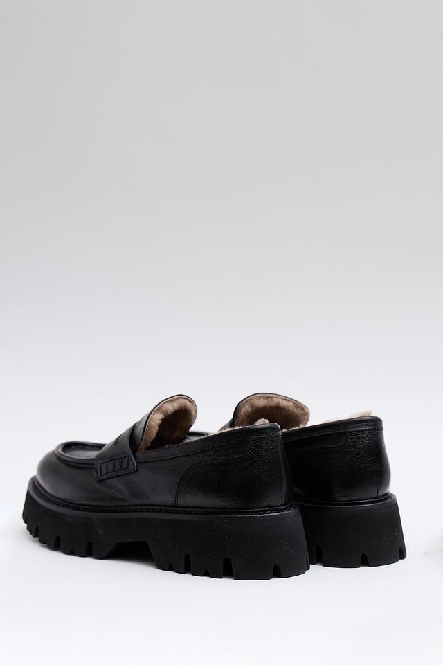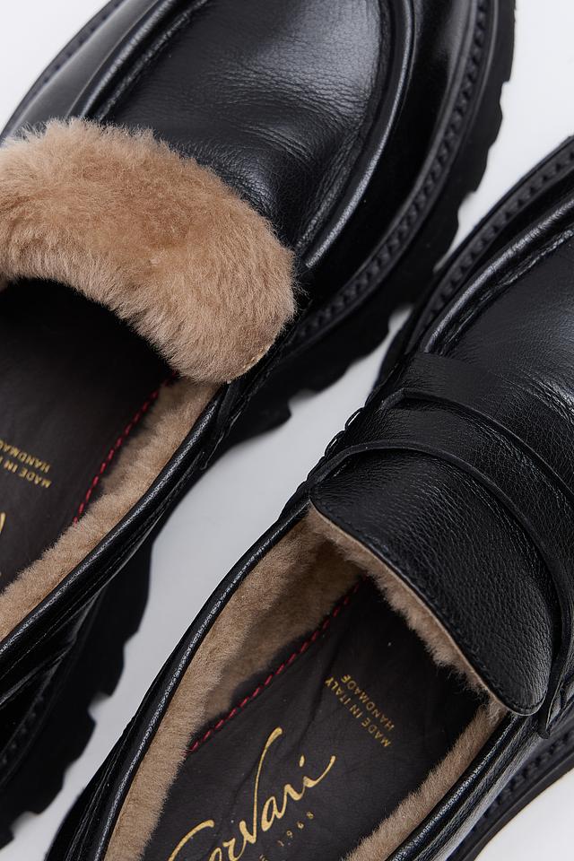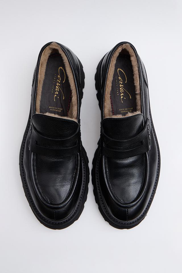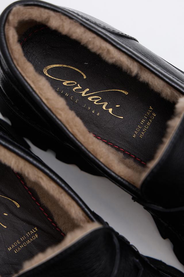 Чёрные лоферы Corvari из натуральной кожи с меховой подкладкой — стильное и комфортное решение для холодного времени года. Массивная подошва обеспечивает устойчивость и современный вид. Состав: кожа 100%, Состав_низ резина 100%, Состав_подкладка мех 100%