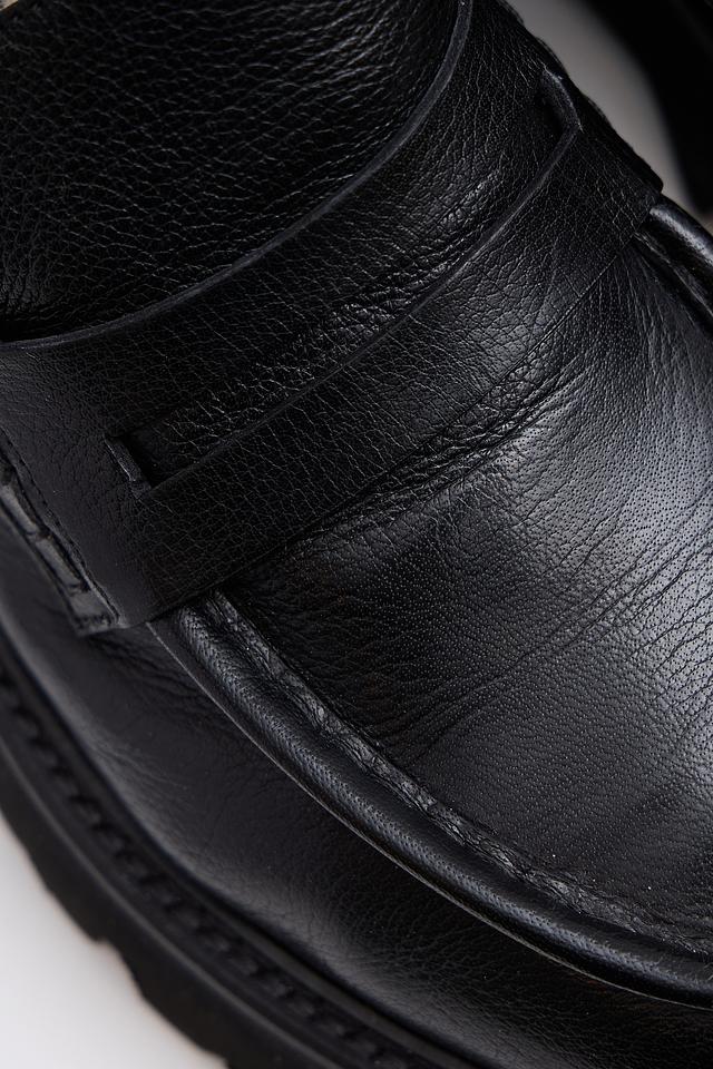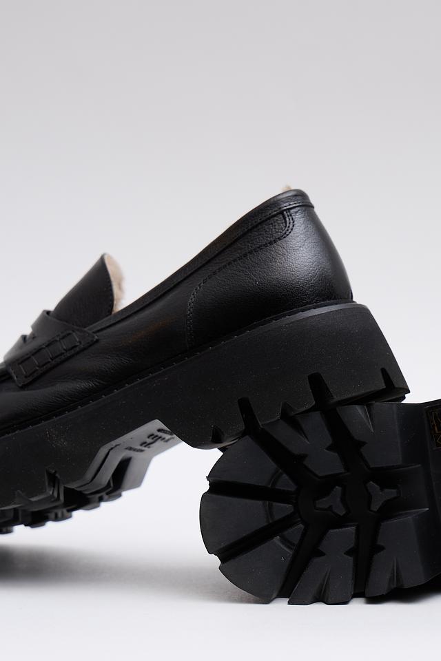 Верх лоферов изготовлен из высококачественной натуральной кожи, что гарантирует долговечность и комфорт при носке. Внутренняя часть обуви утеплена мехом, обеспечивая тепло и уют даже в холодную погоду. Массивная резиновая подошва не только придает обуви современный вид, но и обеспечивает отличное сцепление с поверхностью.