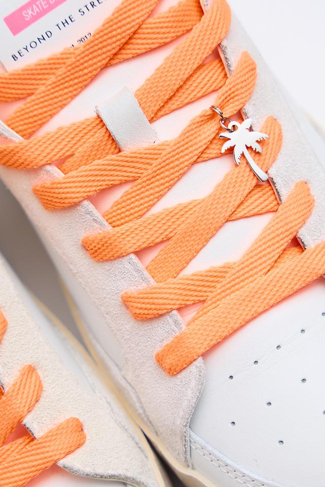 Верх кроссовок выполнен из натуральной кожи, что обеспечивает комфорт и долговечность. Оранжевые шнурки добавляют яркий акцент, а декоративные элементы в виде пальм придают обуви уникальный стиль.