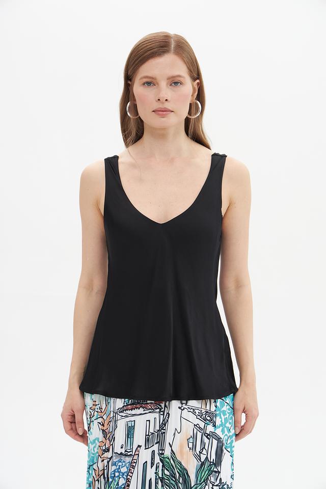 Топ имеет лаконичный дизайн с V-образным вырезом и тонкими бретелями, что делает его универсальным для различных стилей. Его можно сочетать с джинсами, юбками или брюками, создавая как повседневные, так и более элегантные образы.