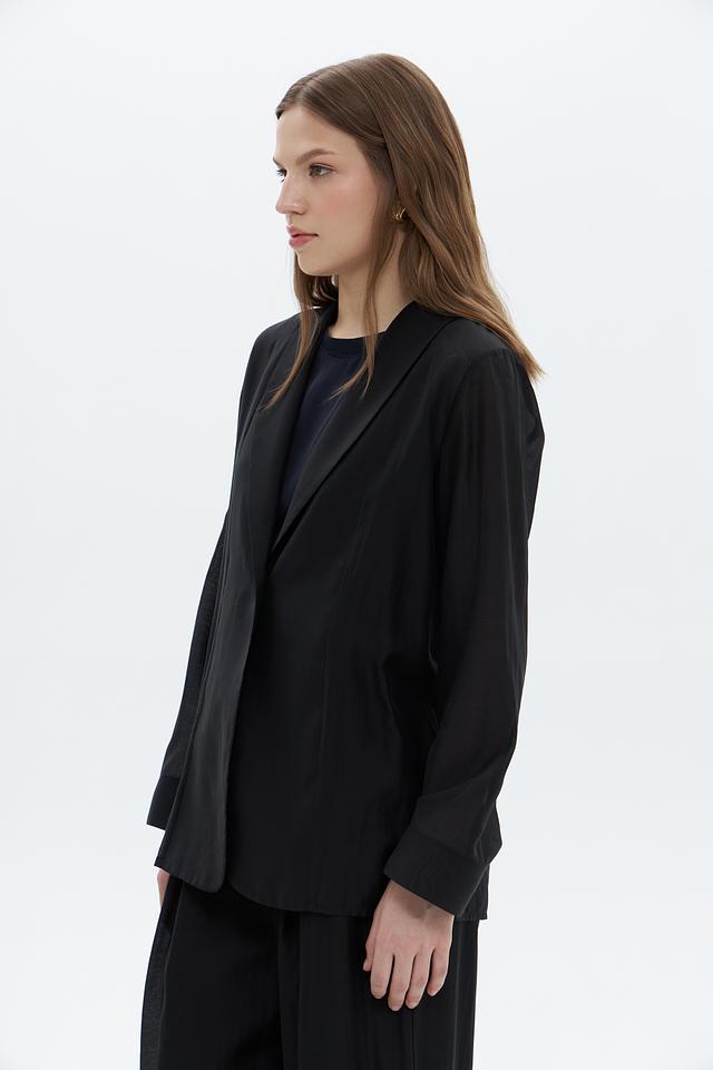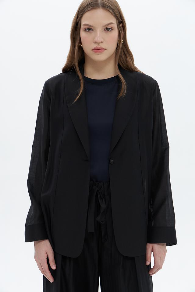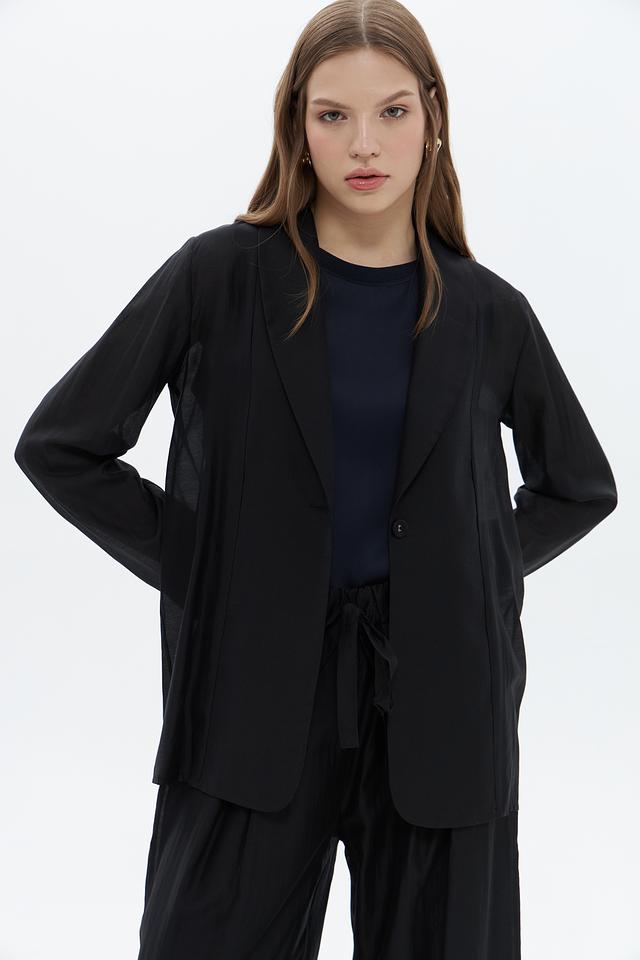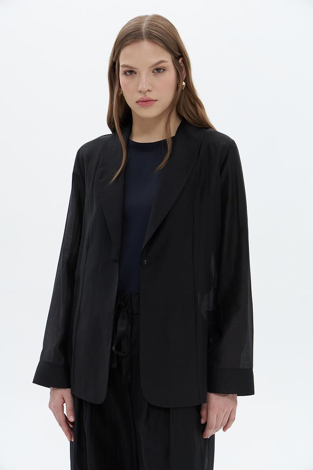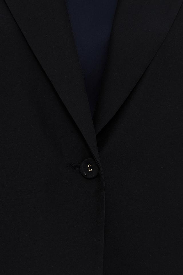 Жакет имеет оверсайз крой, который обеспечивает свободу движений и комфорт. Отложной воротник добавляет модели классический вид, а застёжка на одну пуговицу подчеркивает лаконичность дизайна.