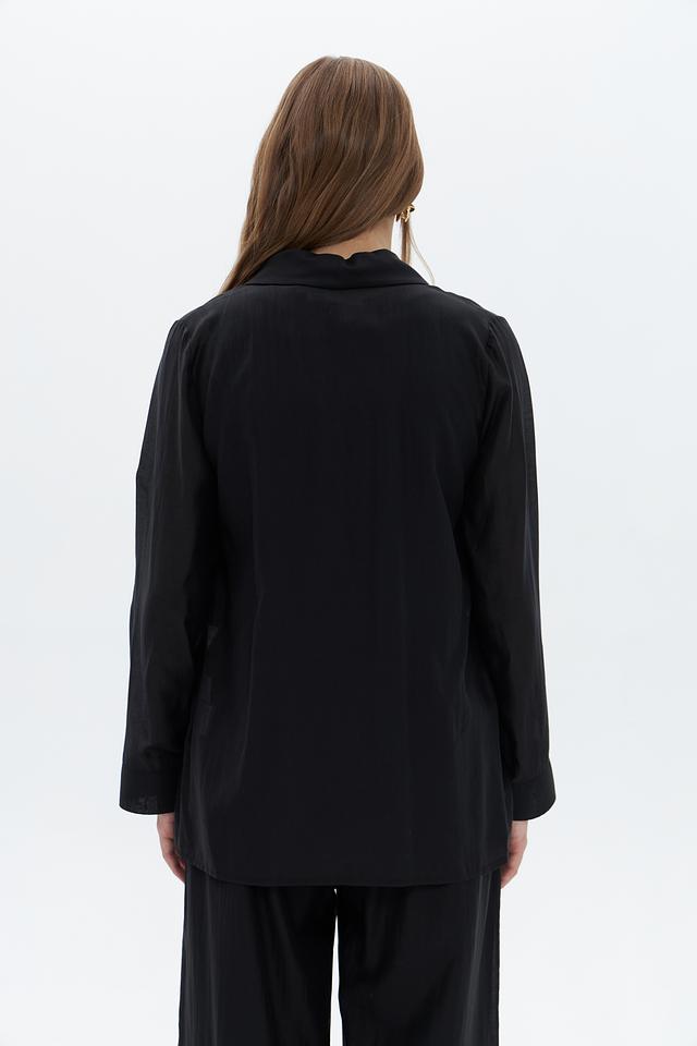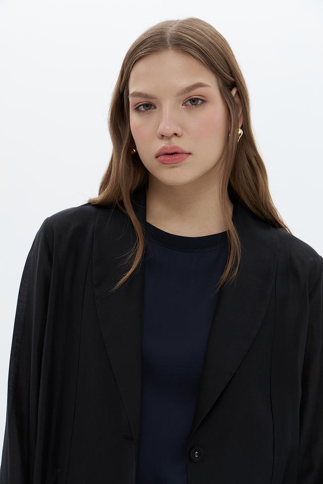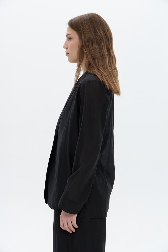 Чёрный жакет Croche оверсайз кроя станет стильным дополнением к вашему гардеробу. Модель выполнена из лёгкой ткани на основе лиоцела, что обеспечивает комфорт в носке. Жакет имеет лаконичный дизайн с классическим отложным воротником. Состав: лиоцел 85%, полиэстер 15%