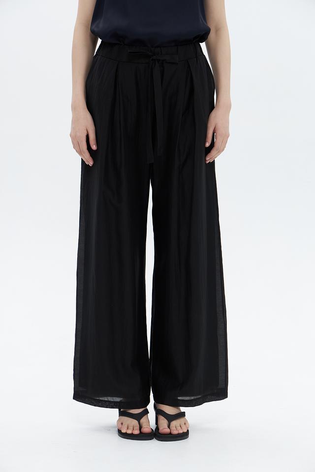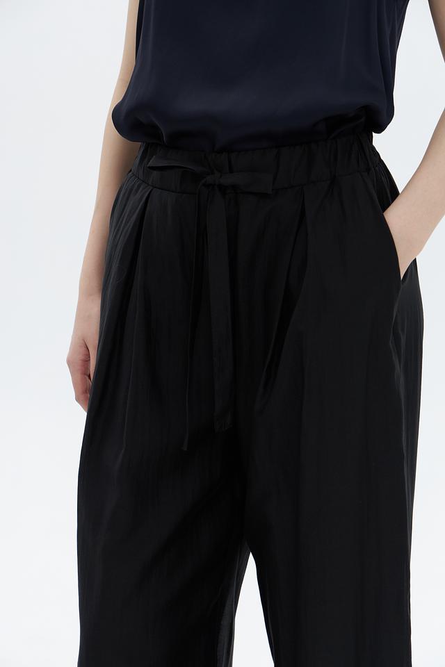Брюки имеют свободный крой, который обеспечивает комфорт и свободу движений. Завышенная талия визуально удлиняет ноги и подчеркивает силуэт. Пояс дополнен завязками, позволяющими регулировать посадку по фигуре.