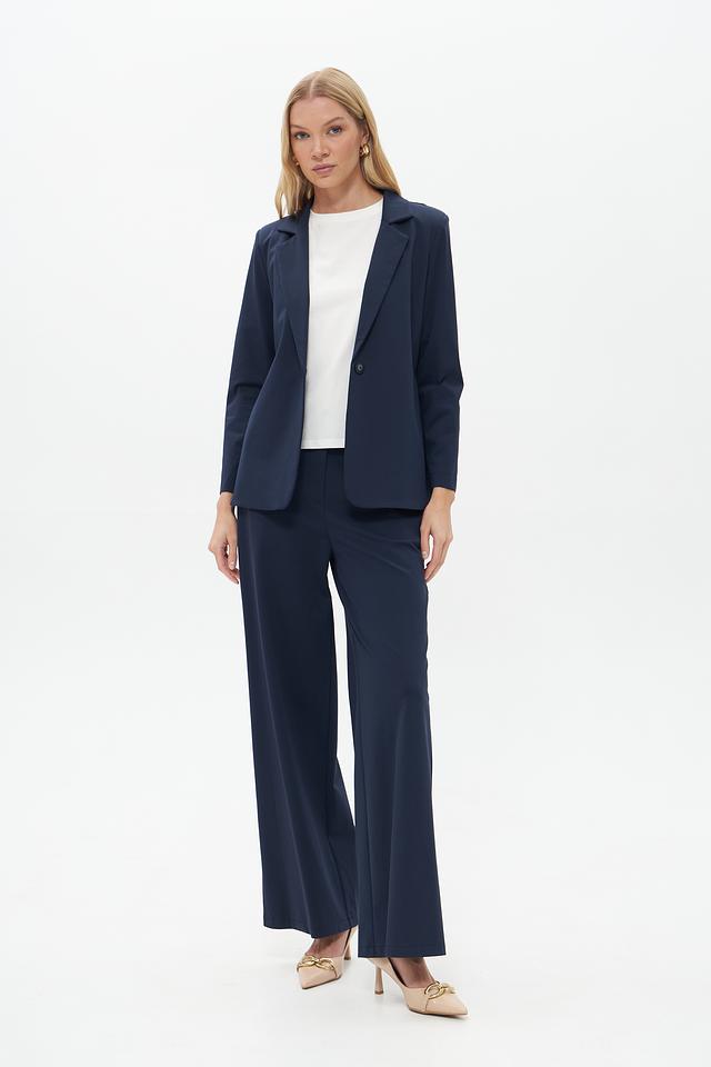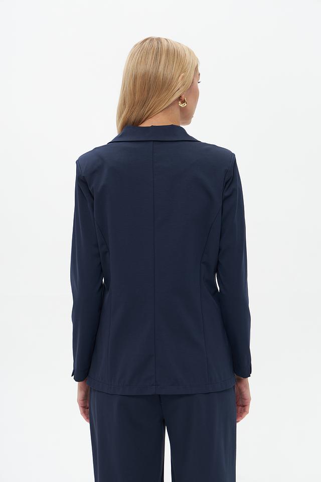 Жакет имеет приталенный силуэт, который подчеркивает фигуру, и однобортную застежку на одну пуговицу. Воротник пиджачного типа добавляет образу строгости и элегантности. Длинные рукава с манжетами.