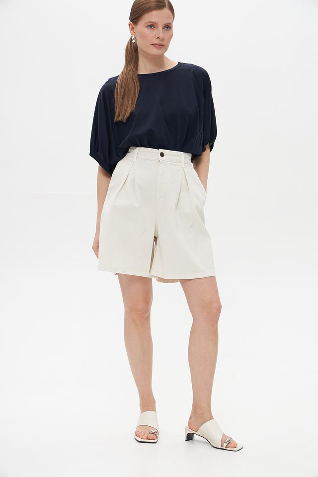 Модель имеет свободный крой и короткие рукава-фонарики, которые придают образу лёгкость и женственность. Округлый вырез горловины делает футболку универсальной и подходящей для разных типов фигуры.