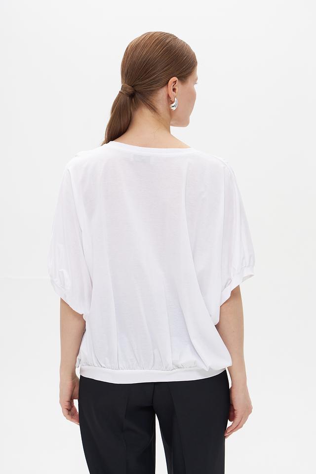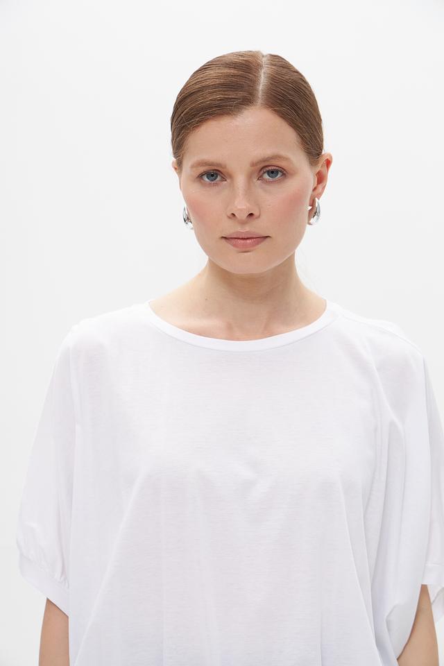 Футболка имеет свободный крой и короткий рукав-фонарик, который придает ей особый шарм и легкость. Округлый вырез горловины подчеркивает женственность силуэта. Минималистичный дизайн позволяет сочетать эту футболку с различными элементами одежды, создавая разнообразные образы.