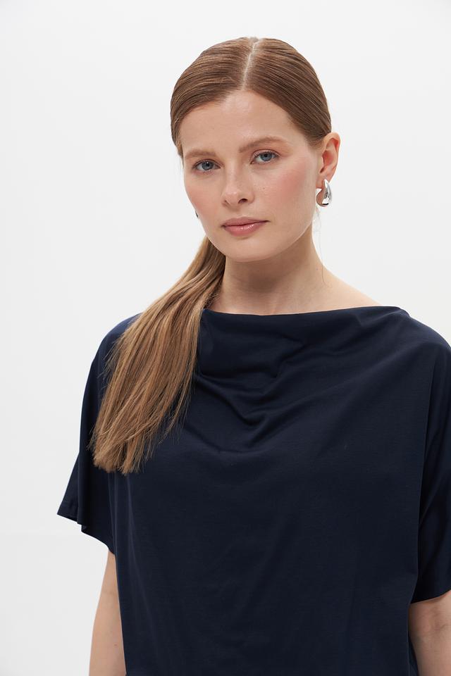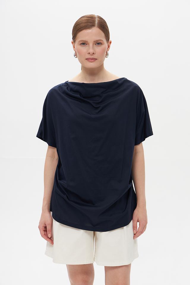 Темно-синяя футболка Croche с драпировкой на плечах – стильное и комфортное решение для повседневного образа. Изготовлена из мягкого хлопка с модалом, обеспечивающего приятные ощущения на коже. Состав: хлопок 50%, модал 50%