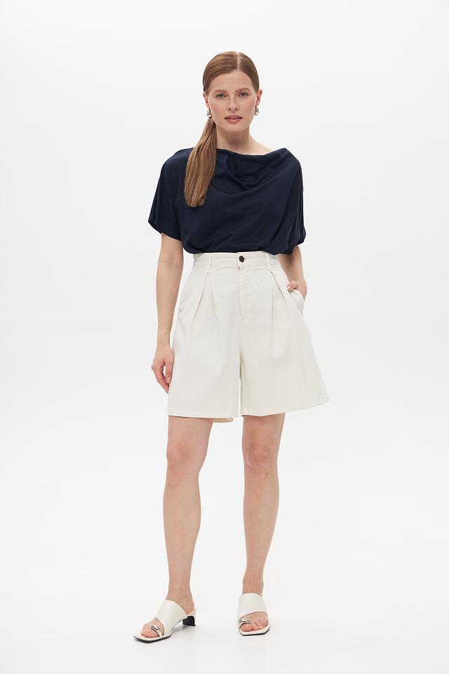 Модель имеет свободный крой, короткие рукава и округлый вырез горловины. Драпировка создает эффект асимметрии и добавляет изюминку в базовый гардероб.