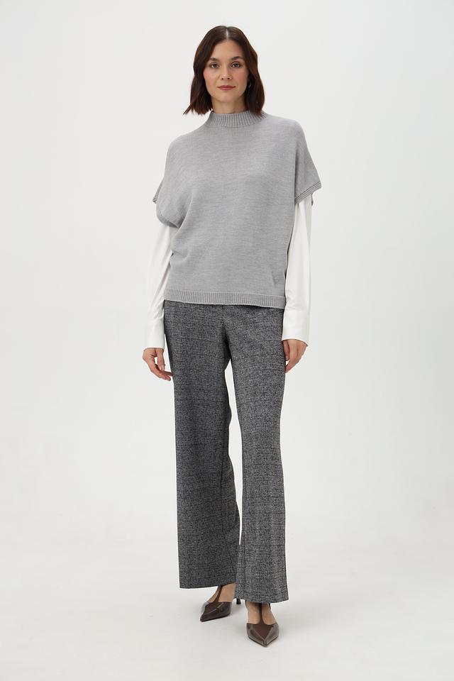 Жилет имеет прямой крой и высокий ворот, что придает ему элегантный вид. Изготовлен из мягкого трикотажа, обеспечивающего комфорт при носке. Модель без рукавов позволяет создавать многослойные образы.