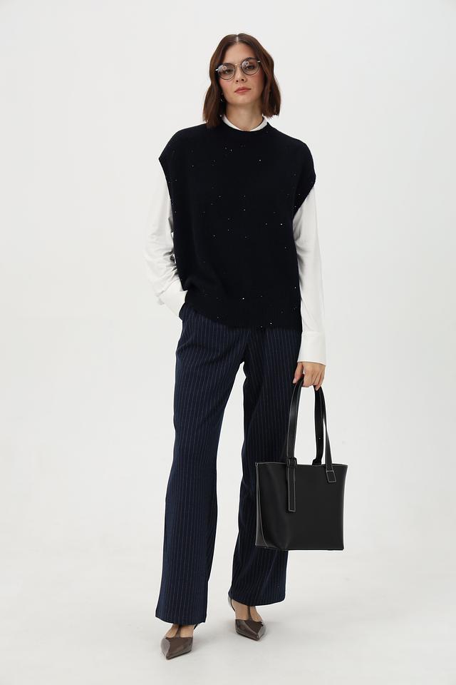 Жилет имеет свободный крой и округлый вырез, что обеспечивает комфортную посадку по фигуре. Декоративная вышивка в виде мелких точек добавляет изделию изысканности и оригинальности.