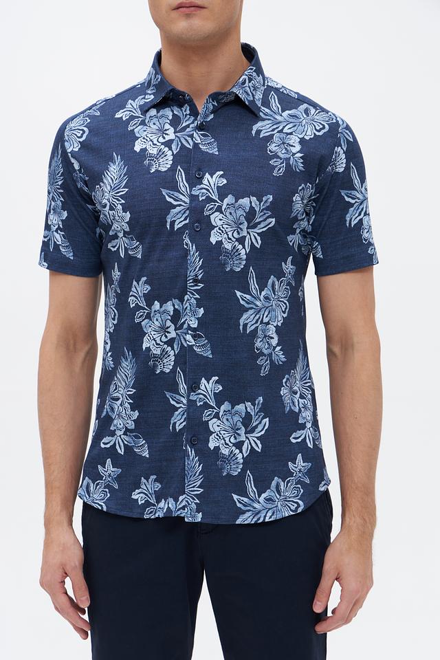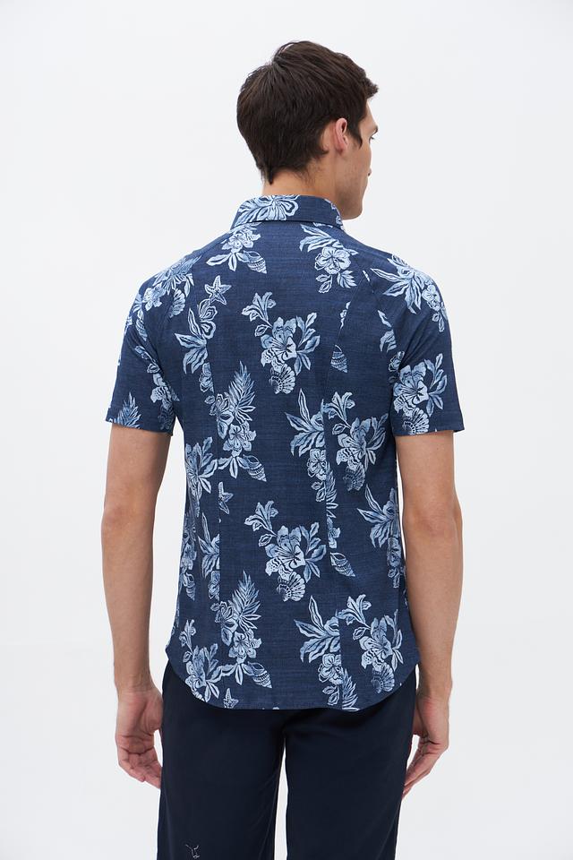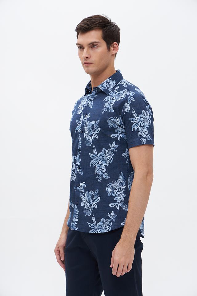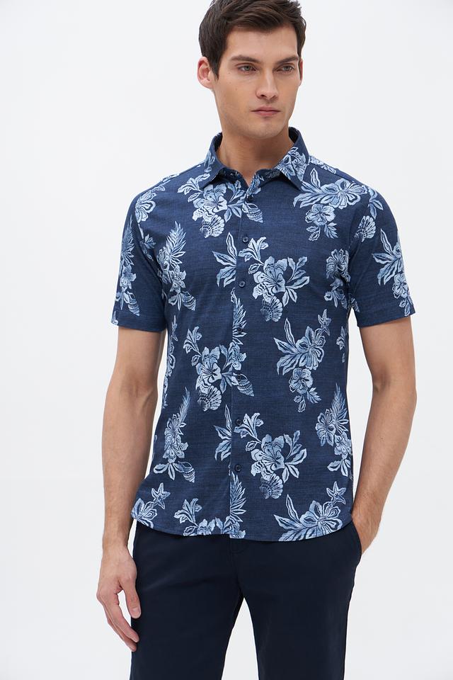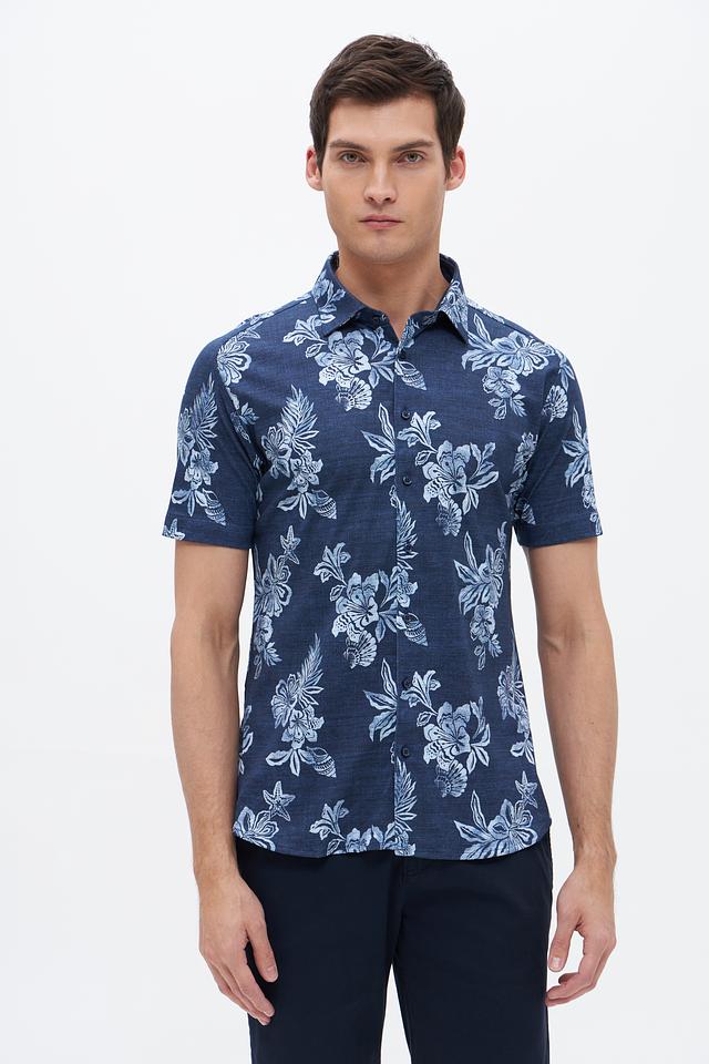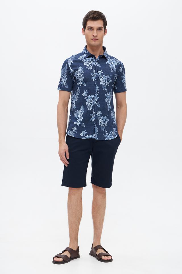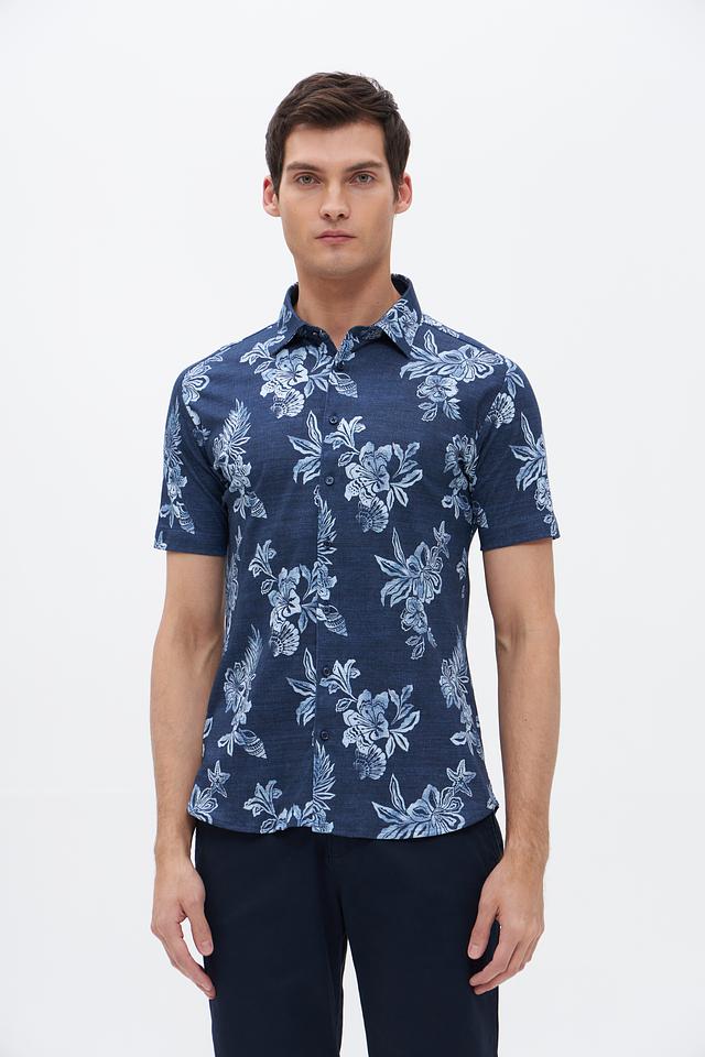 Мужская рубашка Desoto синего цвета с коротким рукавом, украшенная ярким цветочным принтом. Изготовлена из 100% хлопка, обеспечивающего комфорт и воздухопроницаемость. Идеальный выбор для создания стильного летнего образа. Состав: хлопок 100%