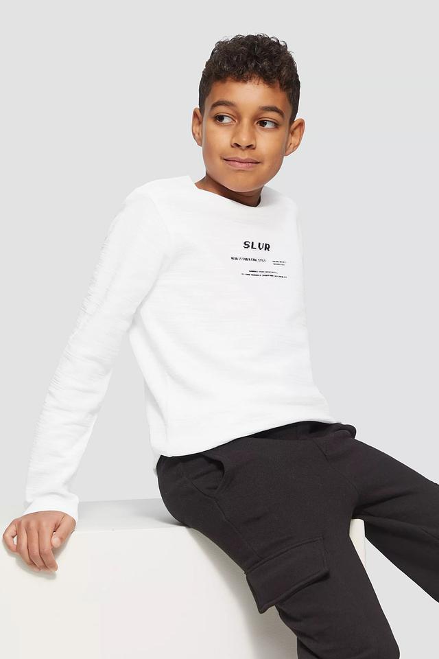Эта футболка отлично подойдет как для школы, так и для прогулок с друзьями. Универсальный белый цвет и лаконичный принт с надписью "SLUR" добавляют изюминку, подчеркивая индивидуальность ребенка. Лонгслив легко сочетается с различными элементами детской одежды, создавая множество стильных образов.