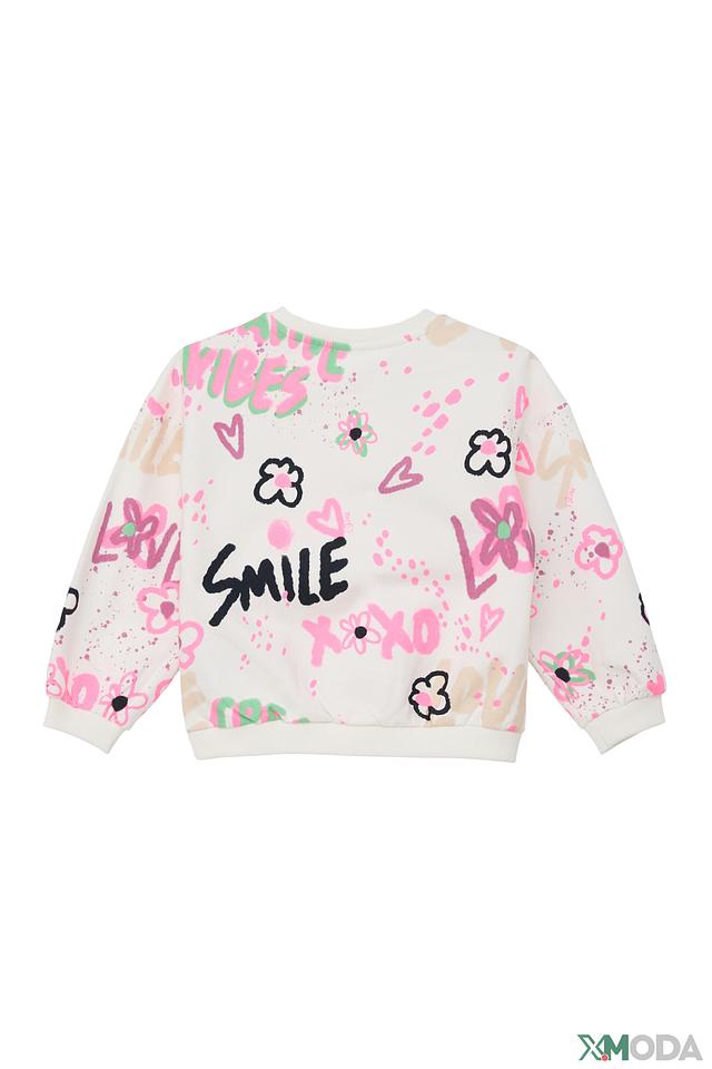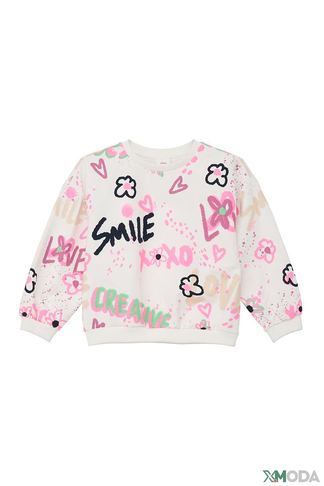 Этот очаровательный пуловер от s.Oliver станет отличным дополнением к гардеробу юной модницы. Пуловер выполнен в белом цвете и украшен красочным принтом с надписями "SMILE", "LOVE", "CREATE" и изображениями цветов и сердечек.