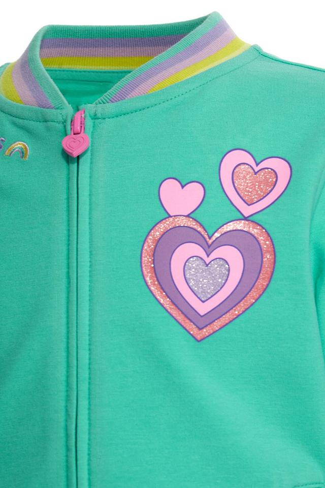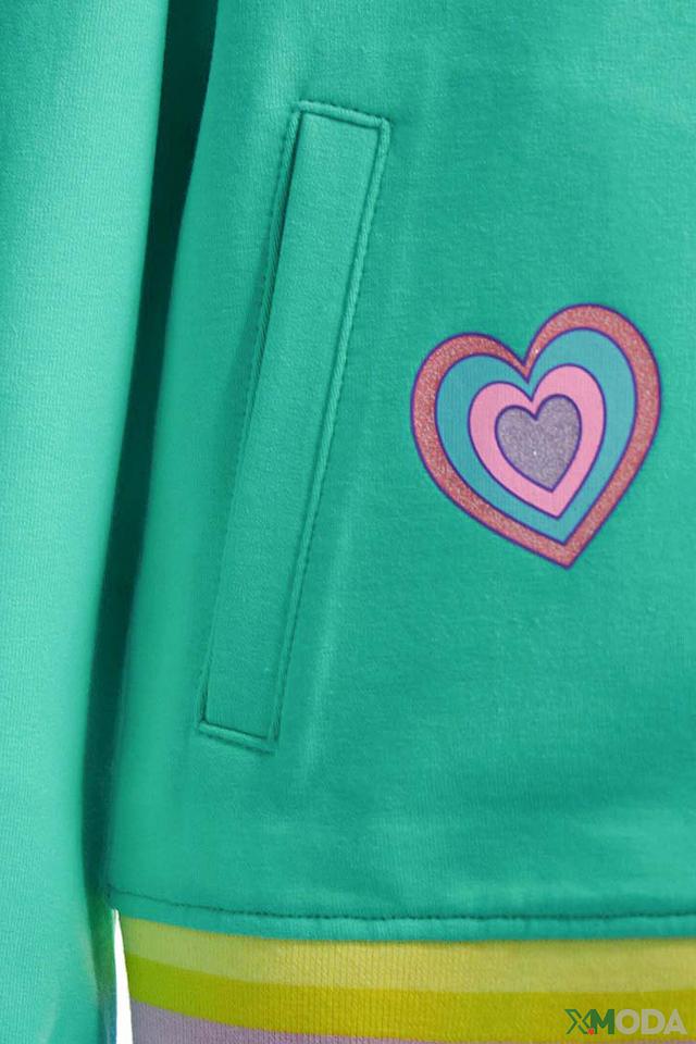 Куртка имеет удобную застежку-молнию, манжеты и нижний край отделаны полосками в контрастных цветах – розовом, желтом и фиолетовом. На груди и спине расположены красочные аппликации с сердечками и забавными надписями, которые придают изделию игривый и оригинальный вид.