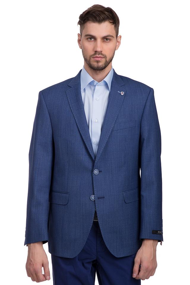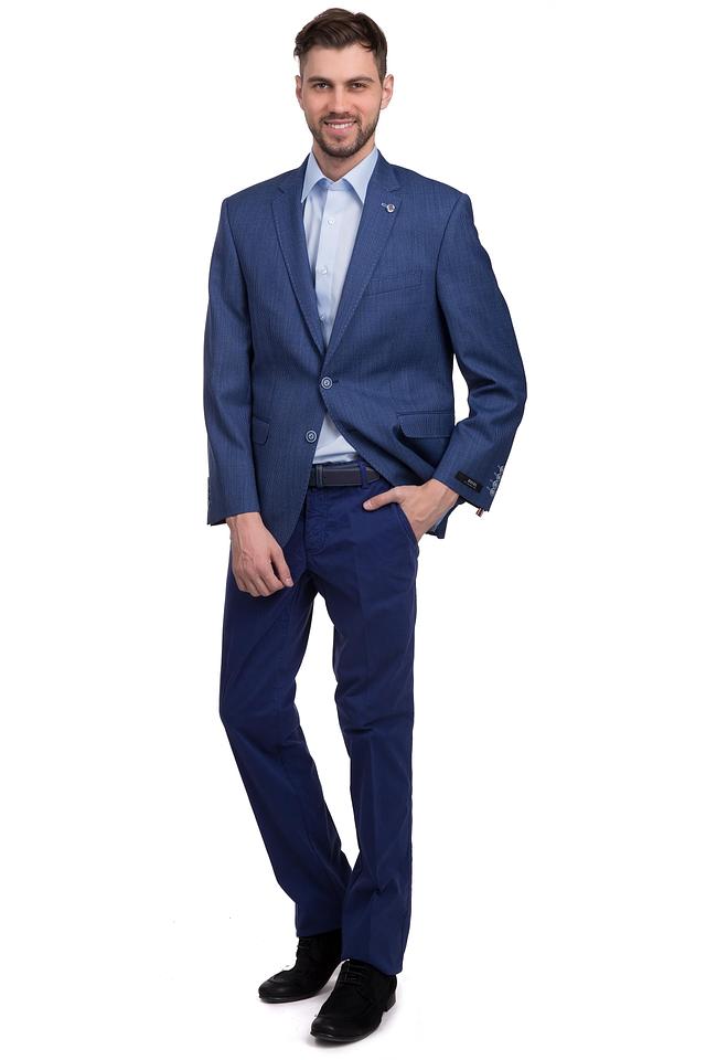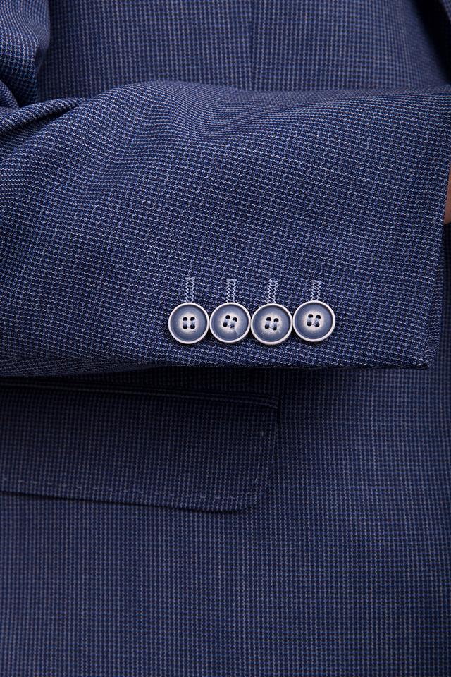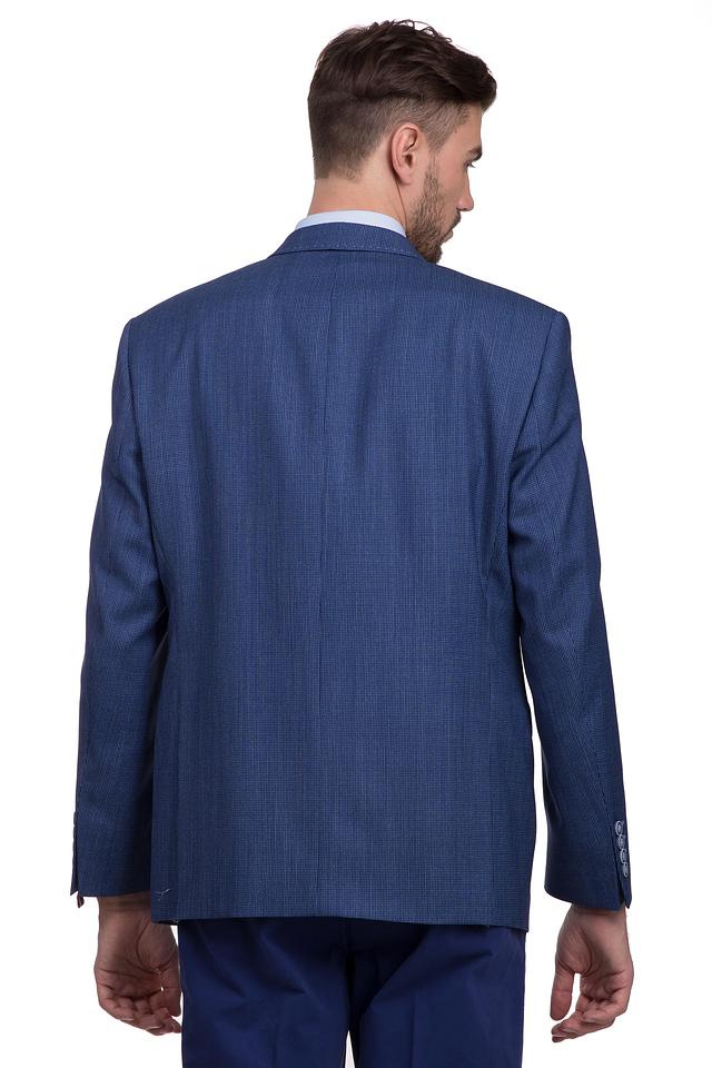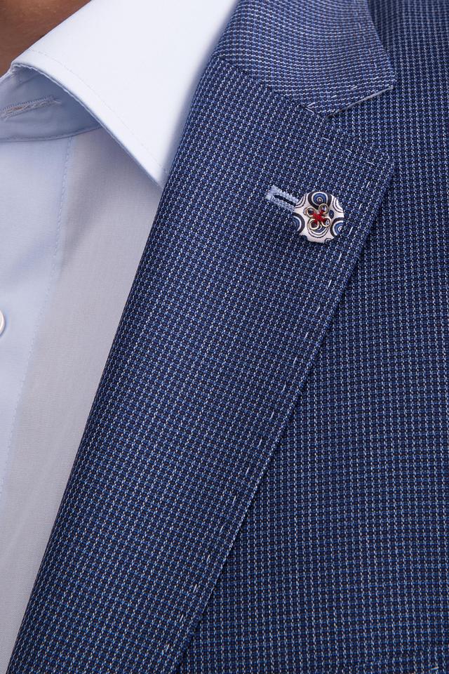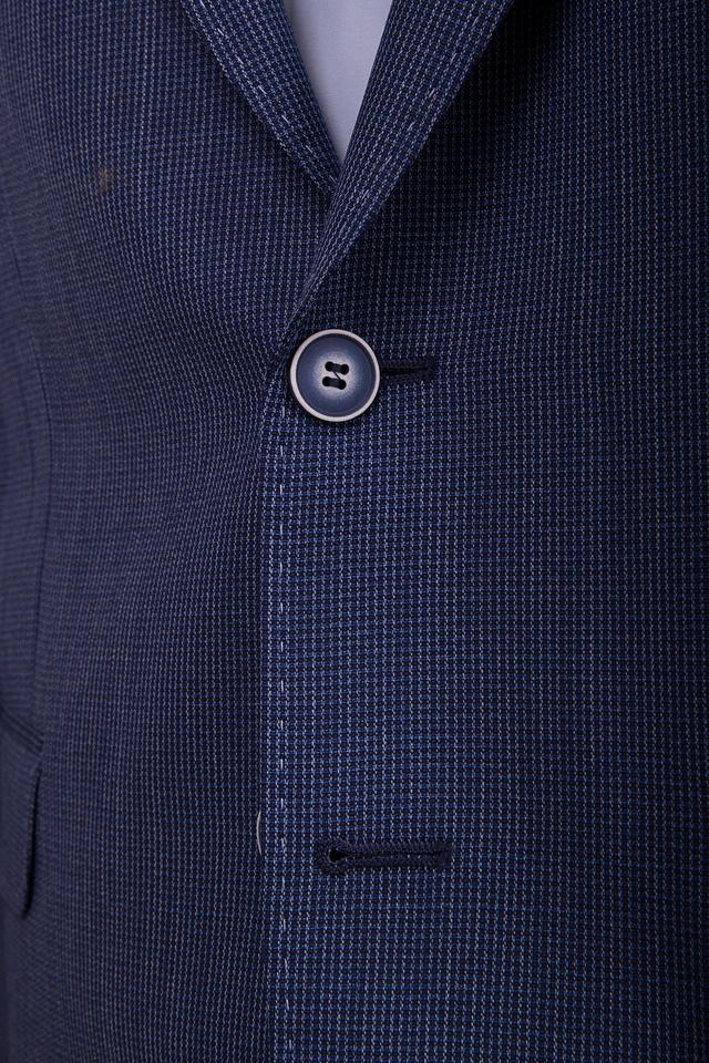Основной цвет пиджака – синий, с выразительным клетчатым рисунком. Модель застегивается на одну пуговицу. На лацкане пиджака предусмотрена петлица для нагрудного платка.